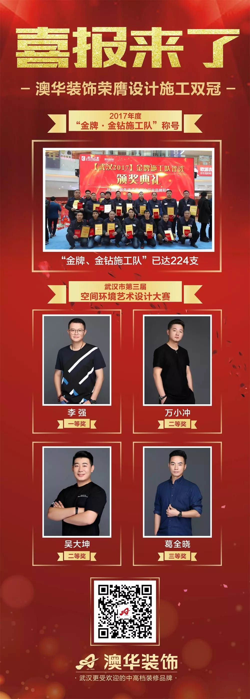 澳华装饰本次有4位设计师荣获一、二、三等奖,他们分别是:李强(别墅空间类一等奖)、吴大坤(平层空间类二等奖)、万小冲(平层空间类二等奖)、葛全晓(平层空间类三等奖);6位设计师荣获平层空间设计类优秀奖。