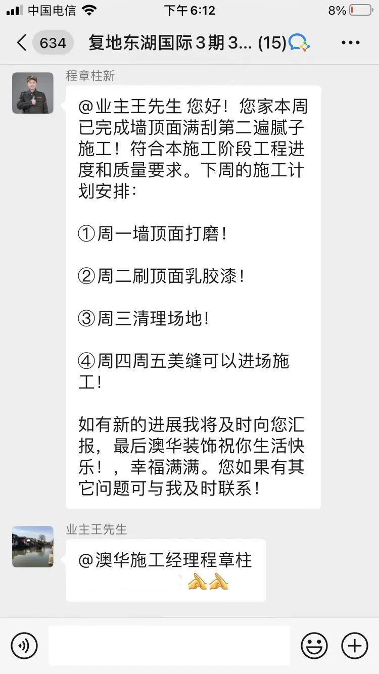 因为有过一套房子的装修经验,业主王先生自己便是半个装修专家,对设计细节、施工工艺、材料品质、服务过程有非常严格的要求。为了让客户放心,设计师及交付团队,实时在微信群众进行进度播报,让业主及时了解每一项施工过程及细节。