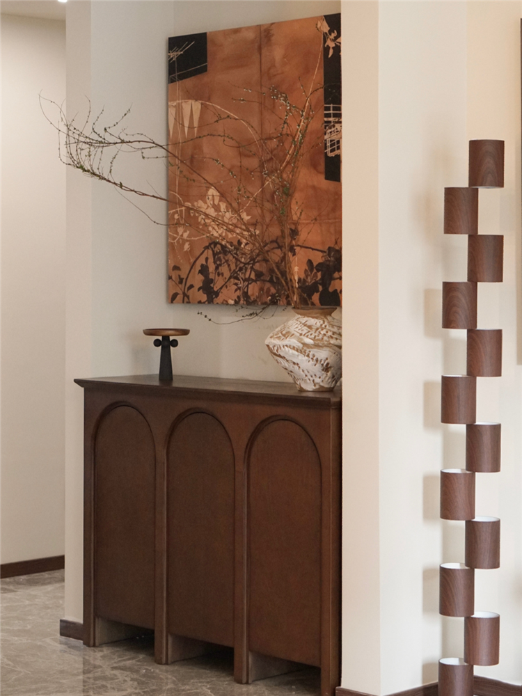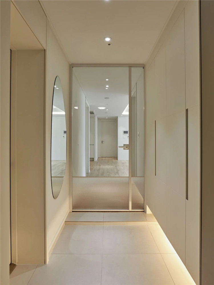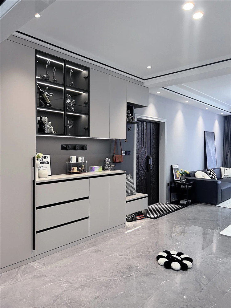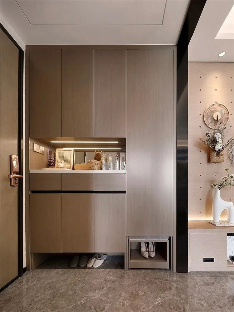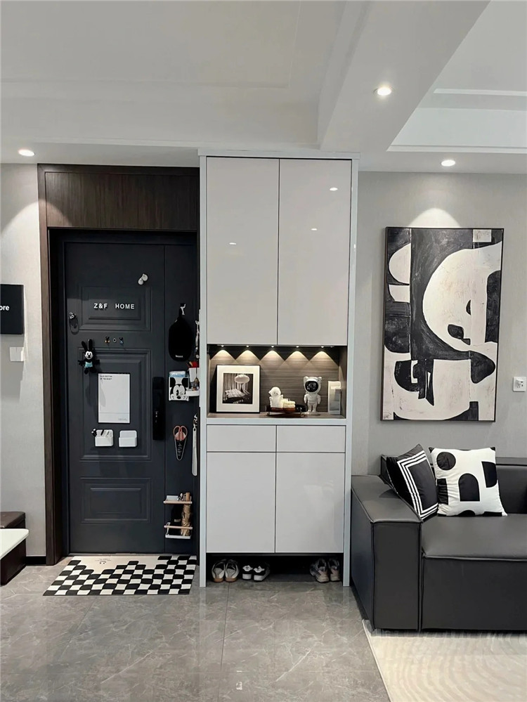 比如开门就是客餐厅,且公区面积较大的户型 6686官方版app,可以尝试在入户门平行的地方定制一组玄关柜,这样就解决了入户收纳问题,也不影响整体通透性与美观性。