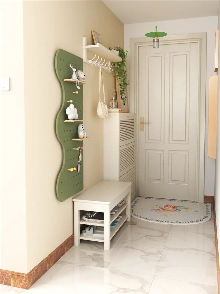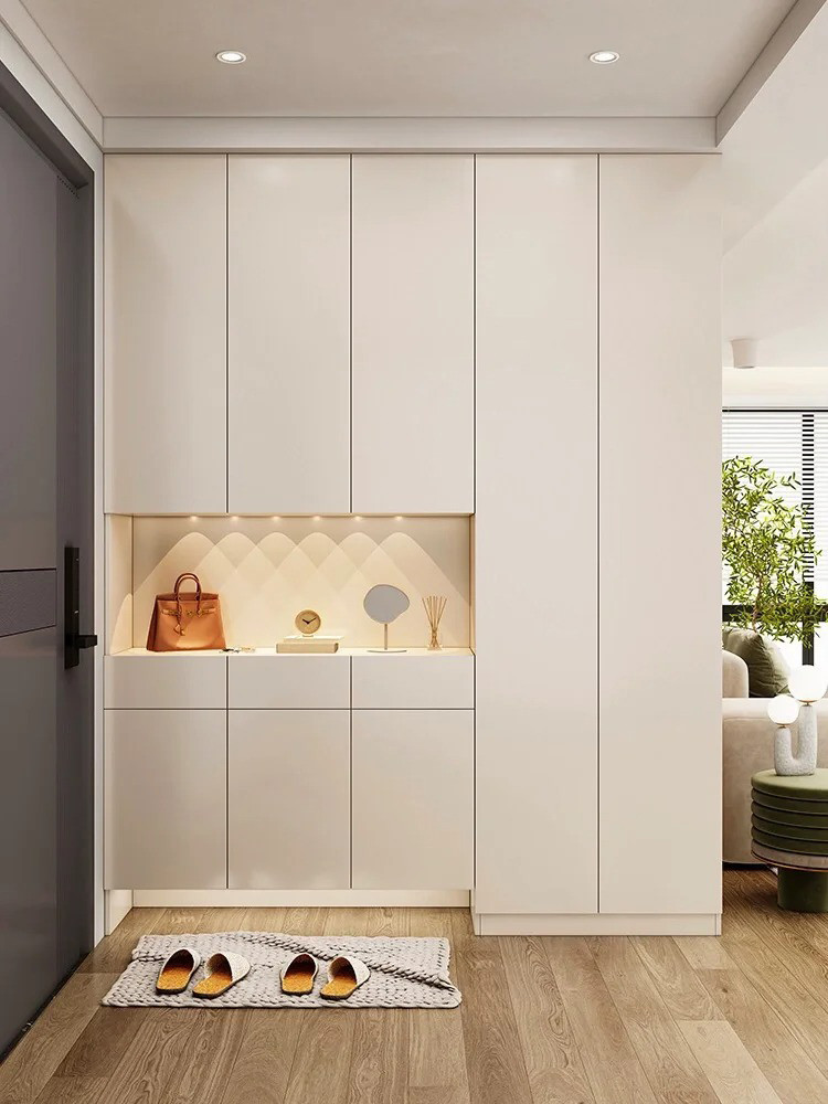 有一些特殊户型,入户门正对墙面,这时不用着急,直接将收纳柜放在墙的前方就行。