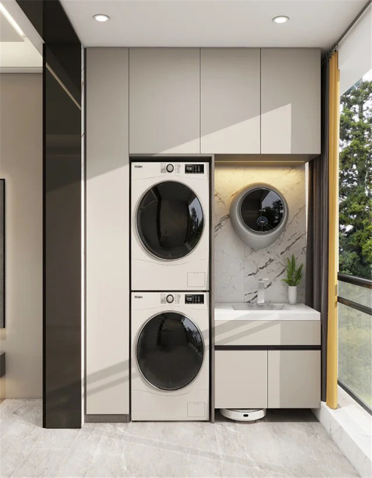 家务减负第一步,先要在家里规划一个家政区。一般建议定制一组家政柜,集中存放各种清洁工具和清洁用品,用的时候拿取方便,柜门关上,整齐利落。