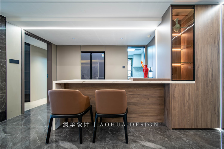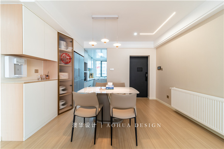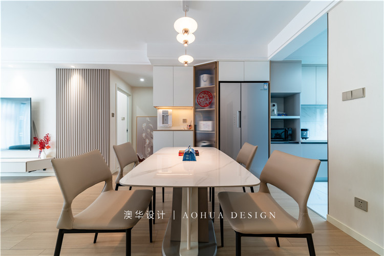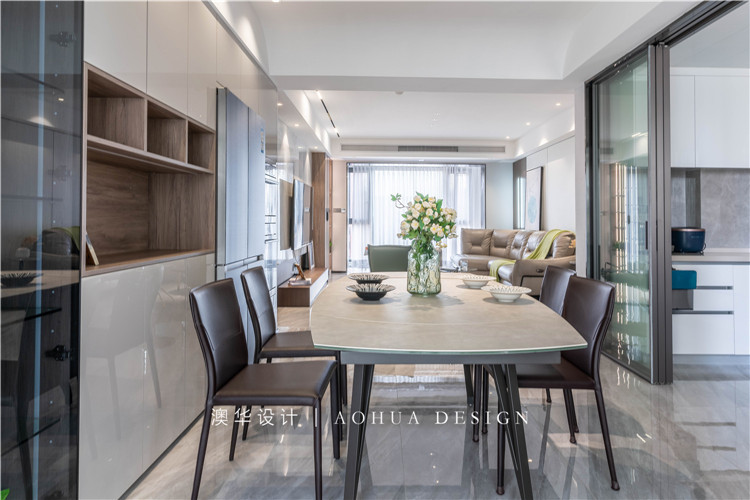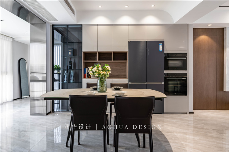 在【中建星光城】这个项目中,橱柜与餐边柜衔接,冰箱内嵌其中,无论是从餐厅还是厨房,取物都非常方。