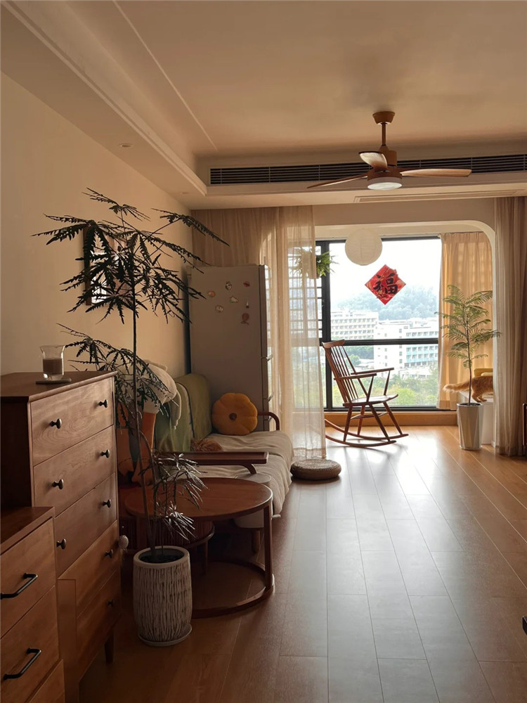 如果厨房与餐厅的面积都不够放冰箱的话,也可以把冰箱放在客厅区域,反正冰箱是必要的一件电器,总要有个摆放的位置!