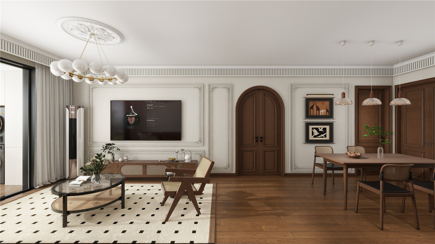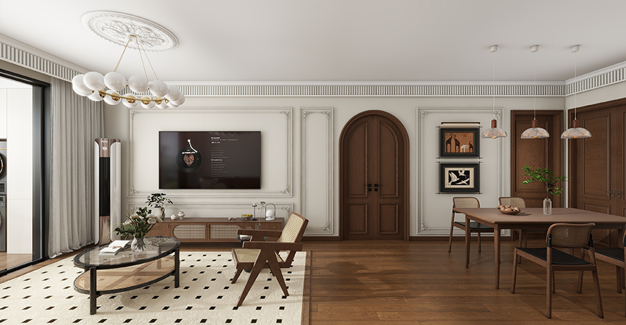 带有暗纹处理的壁纸搭配上菱形纹理地板,奠定了精致的格调氛围。而桌椅、吊灯等细节设计,则为空间增添艺术时尚气息。