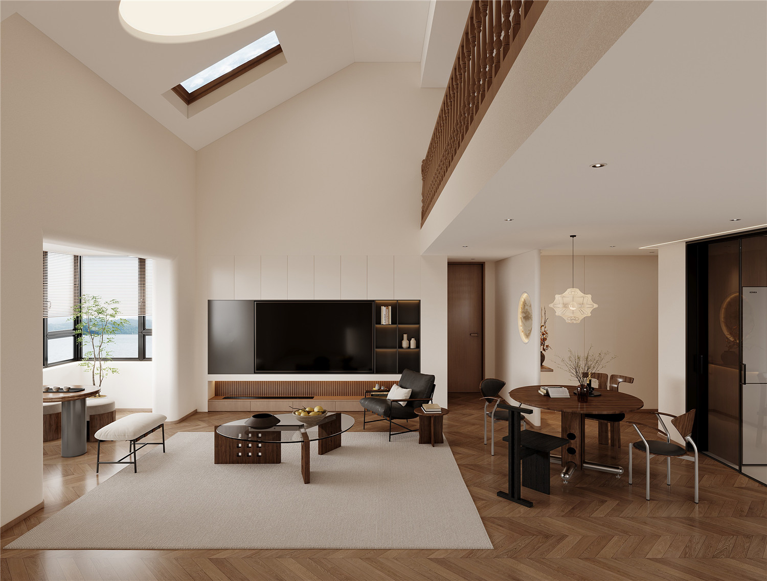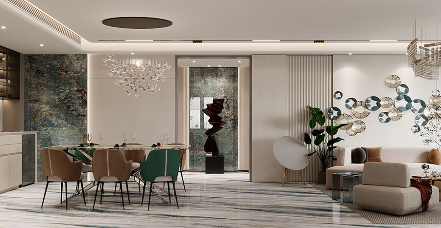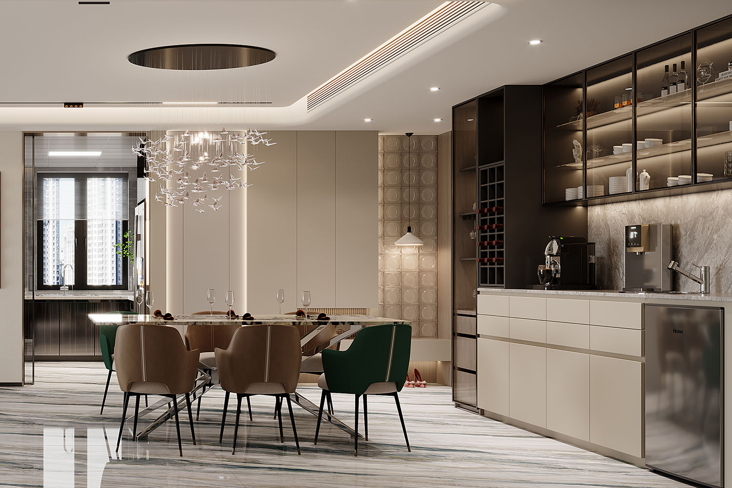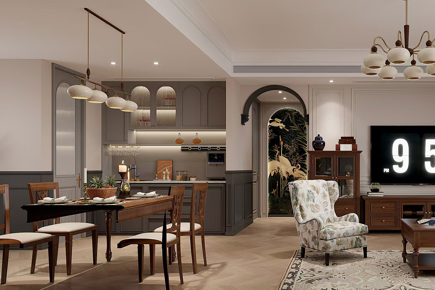 餐厅区域沿用了与客厅空间相同的配色与用材,不同的是设计感十足的吊灯与清新感十足的花鸟挂画 6686官方版app,让就餐区域多了一抹温馨靓丽气息。
