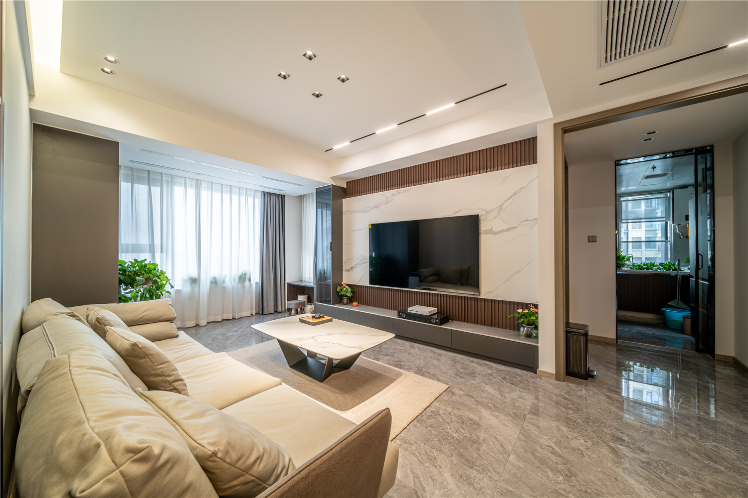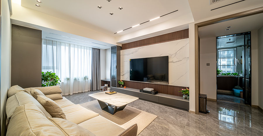 木质的沙发背景墙给人以温厚舒适的自然问西岗 6686官方版app,搭配上浅色沙发,营造清新优雅之美。