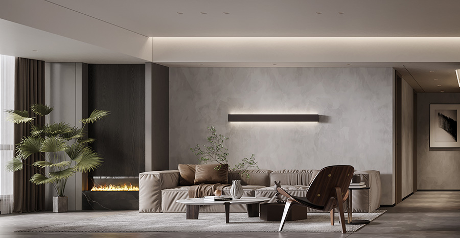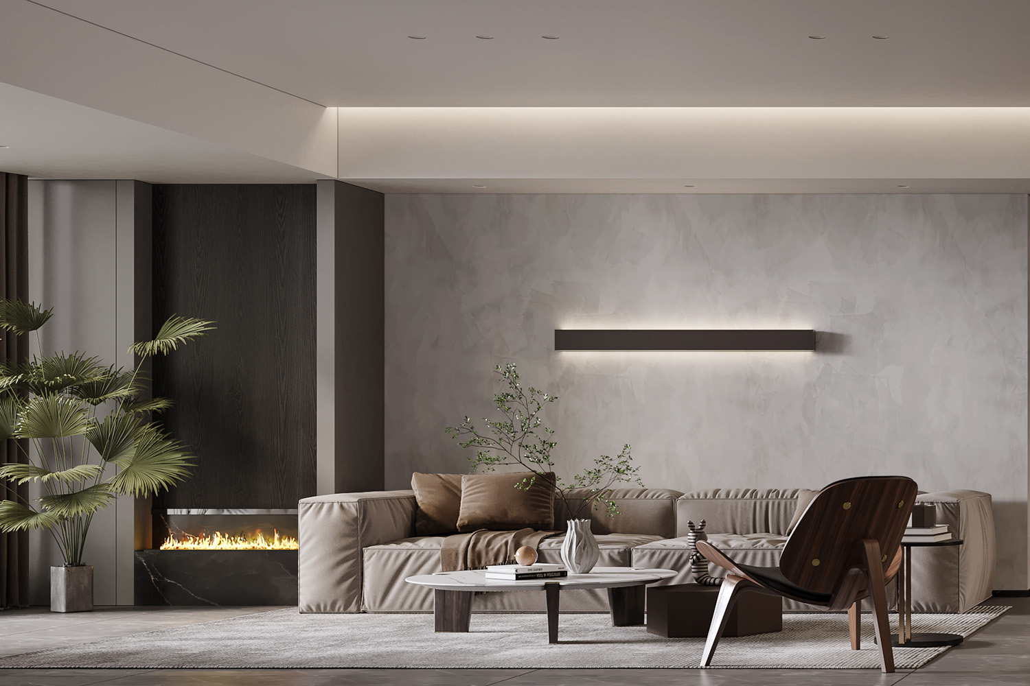 客厅以咖色系为主基调,浪漫的配色带有女王气质,简约的线条中不失轻奢韵味,背景墙一面设计为书柜,一面设计为办公空间,别有一番风味,灰色绒质沙发与橘色单椅围合式放置,空间更具设计感,雕塑,摆件 6686官方版app,灯具等元素,都令客厅带有复古的气息。