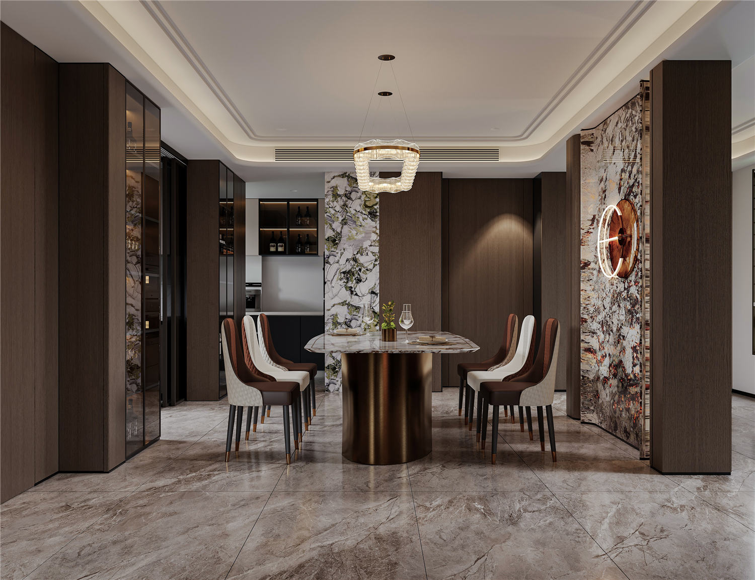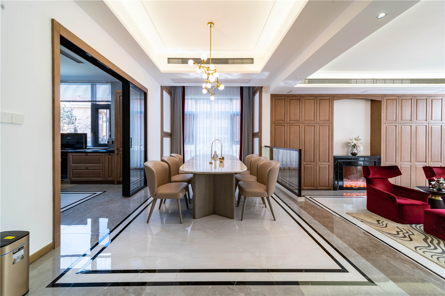 餐厅区域设置在客厅区域的同一直线上,且两个空间之间没有使用硬隔断,有效保障了整个空间的通透感。而餐厅侧面的玻璃墙面设置,则从视觉上起到放大空间的作用,让整个空间更显现代时尚气息的同时更具大气美。