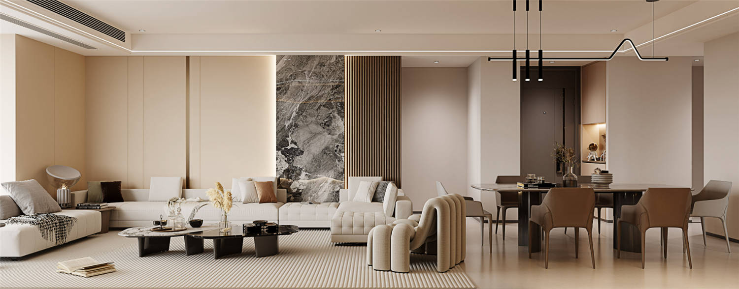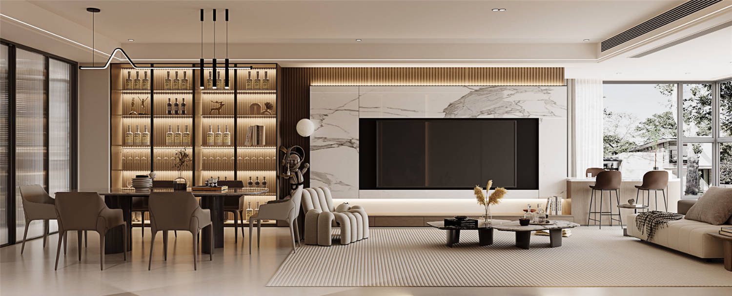 重新排布家居空间的功能形式,矫正其表现形态以完善公共区域的融洽相处。通过客餐厅一体化结合餐岛一体的设计,令家人间的互动更为亲密直接。同时,精细调配空间需求,确保功能与居住舒适感达到完美平衡,营造张弛有度的家居氛围。