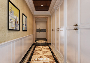 该户型的玄关属于长条形结构 6686官方版app,且相对比较狭窄,所以设计师并没有在该区域做过多的装饰设计,而是利用暖黄色作为主基调色,强调空间的欧式风情,同时借助两幅简约的欧式挂画进行点缀,以提升空间丰富感。