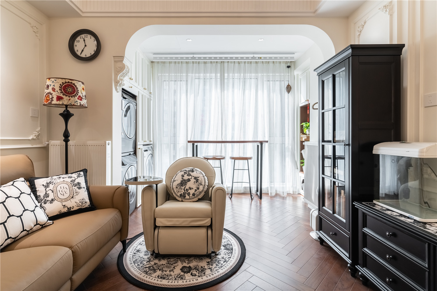 藕色墙面搭配上细线条处理,给人精致的优雅感。弧线形的沙发搭配上圆形茶几,营造柔和的自然舒适感。