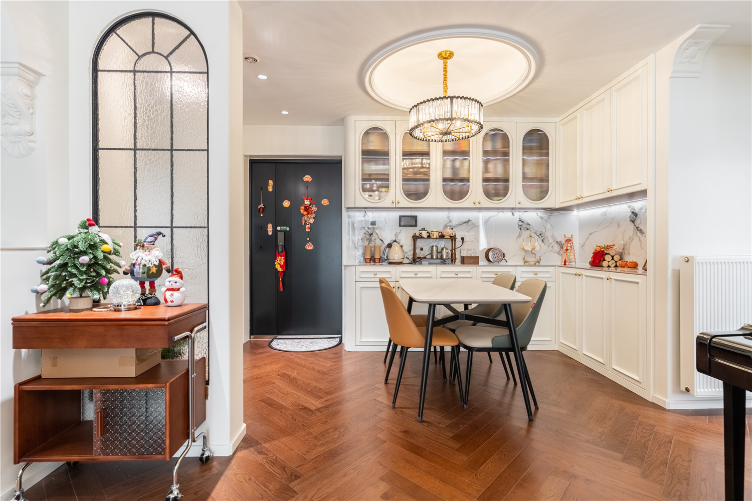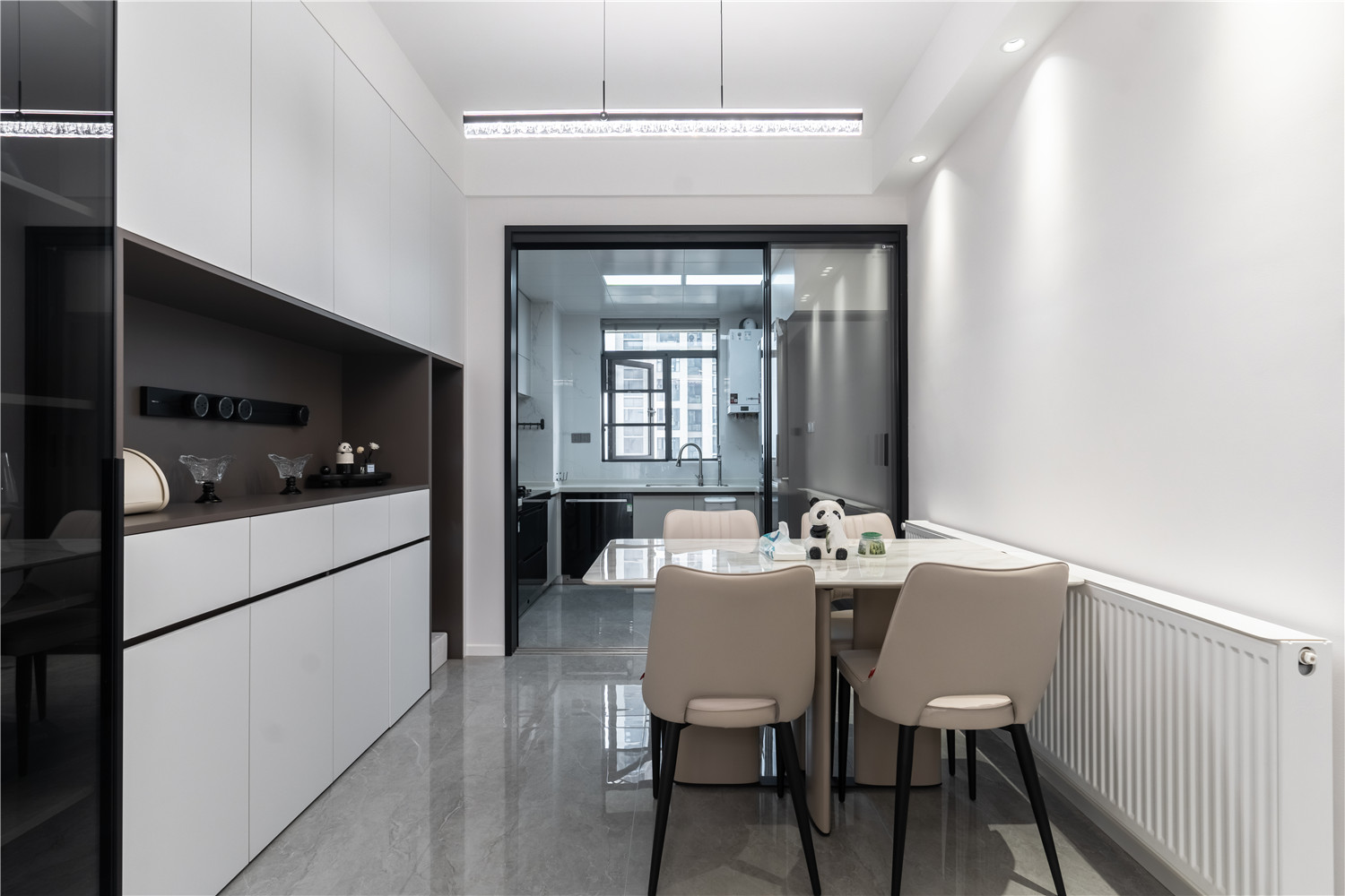 案例简介:对于空间气质的表达是一门艺术,本案例的餐厅呈现暗色系的现代感官,这里没有喋喋不休 宁静有增长心灵的力量,似乎能让人感知优雅的存在。整个家居空间则以原木色与白色为主体,拾取饱和度较低的灰黑色系点缀,让整个空间在舒适简单中隐隐散发高级的质感。