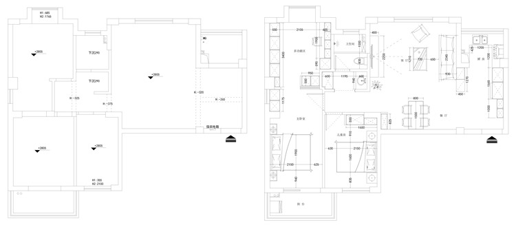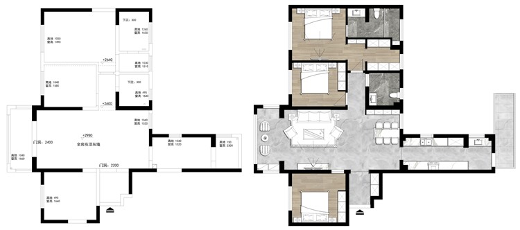 这套位于泛海国际的四居室住宅建筑面积约为175㎡ 6686官方版app,户型结构虽然不算很规整,但是好在也没有各种难以设计处理的犄角空间,为了将空间更加合理的利用,设计师将房屋中相对比较突兀的区域改造成厨房,这样能够借助户型的结构将厨房油烟更好的释放出室外,同时,为了提升主人的家居质量,内部两个小空间则直接融入主卧中改造成主卧附带的卫浴空间与迷你衣帽间。
