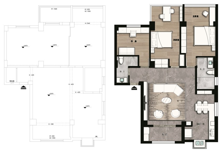 舒心苑这套三居室的住宅占地面积约为145㎡,整个户型结构相对比较规整,不过原有的户型结构并不能很好满足业主的使用需求,因此设计师将主卧区域与外部阳台空间直接打通,将小阳台直接纳入主卧 6686官方版app,提升卧室区域的舒适感与采光度,为了满足业主在家办公及阅读需求,设计师将其中一个次卧改造成小书房,同时将客卫的面积向书房延伸,提升卫浴空间的占地面积,以满足正常使用需求。