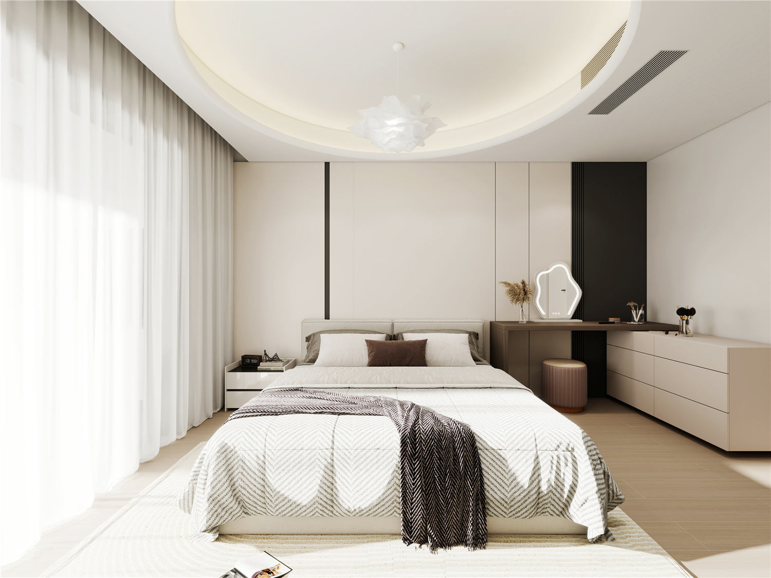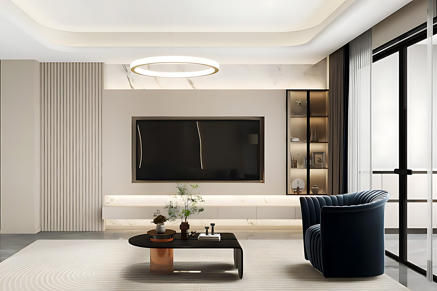原本色搭配上白色强调空间简约整洁氛围,曲线型沙发、圆形吊顶以及圆形地毯则通过线条的变化来提升空间的独特艺术氛围。