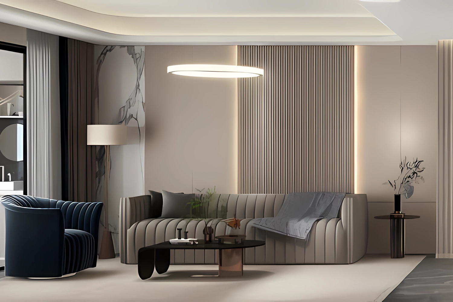 裸墙面搭配上结构式处理简约而又不失个性摩登感,又曲线型打造的地板搭配上圆形茶几,营造超现代的独特品味感。