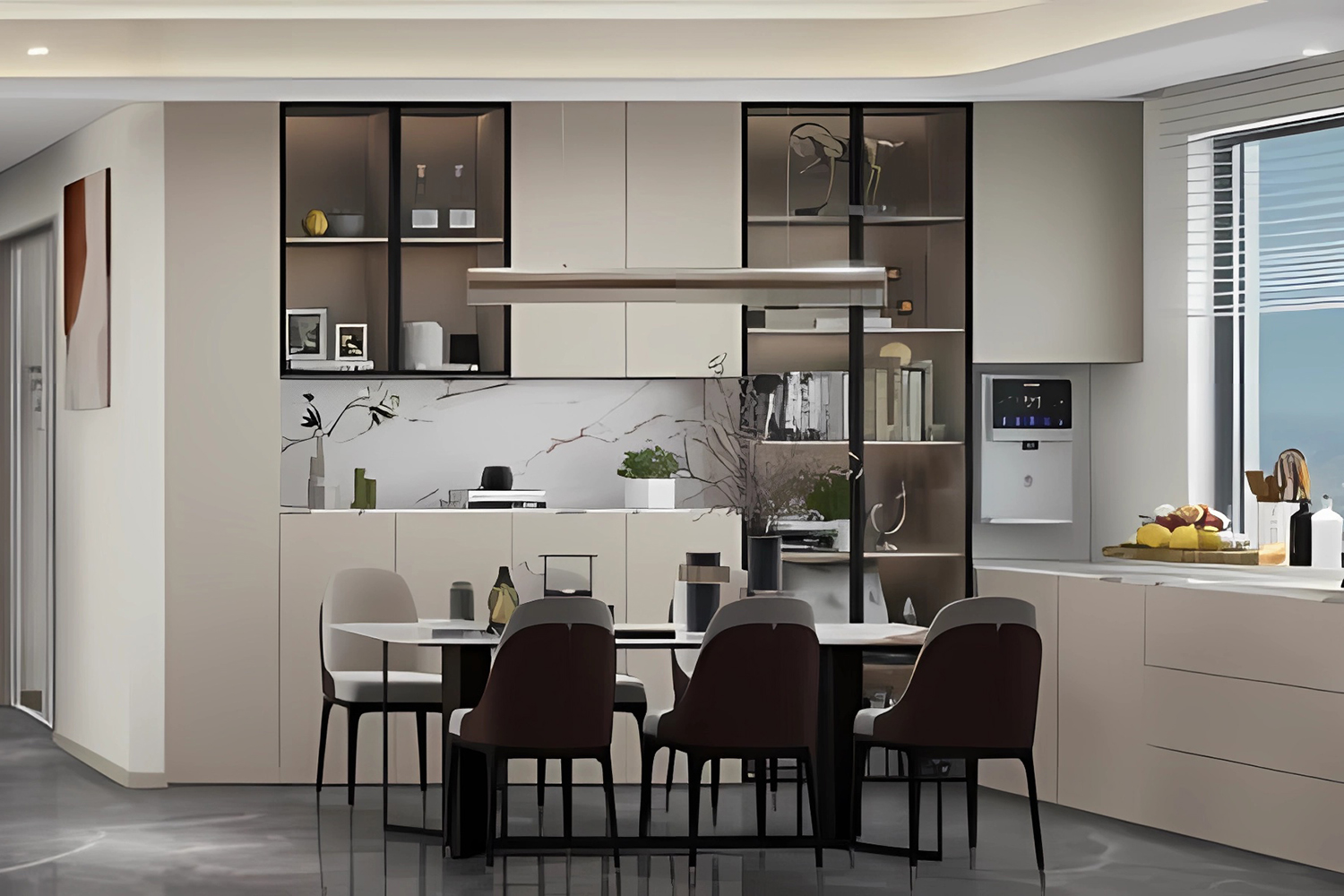 可收纳式的台面有效提升空间利用率,嵌入式双开门大冰箱时尚感十足而又不失实用性。