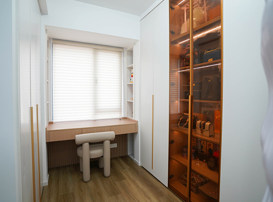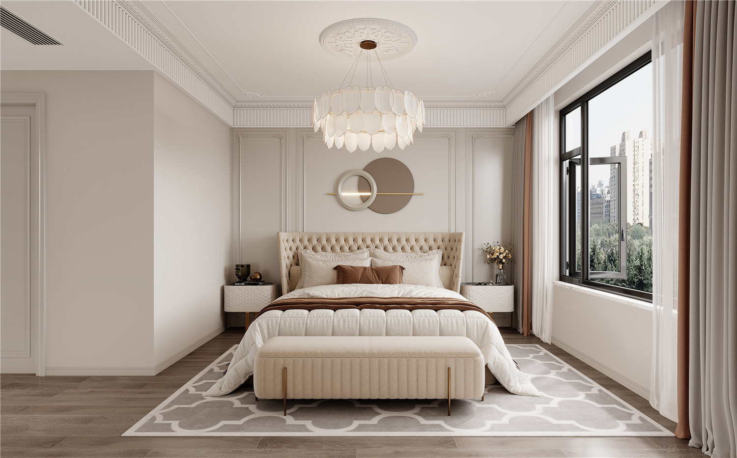 为了提升主卧区域的静谧感,设计时使用了相对比较柔和的灰白配色,同时借助柔软的地毯与温润感十足的木质地板来营造休憩空间的温馨柔和氛围。