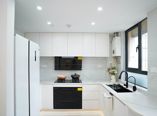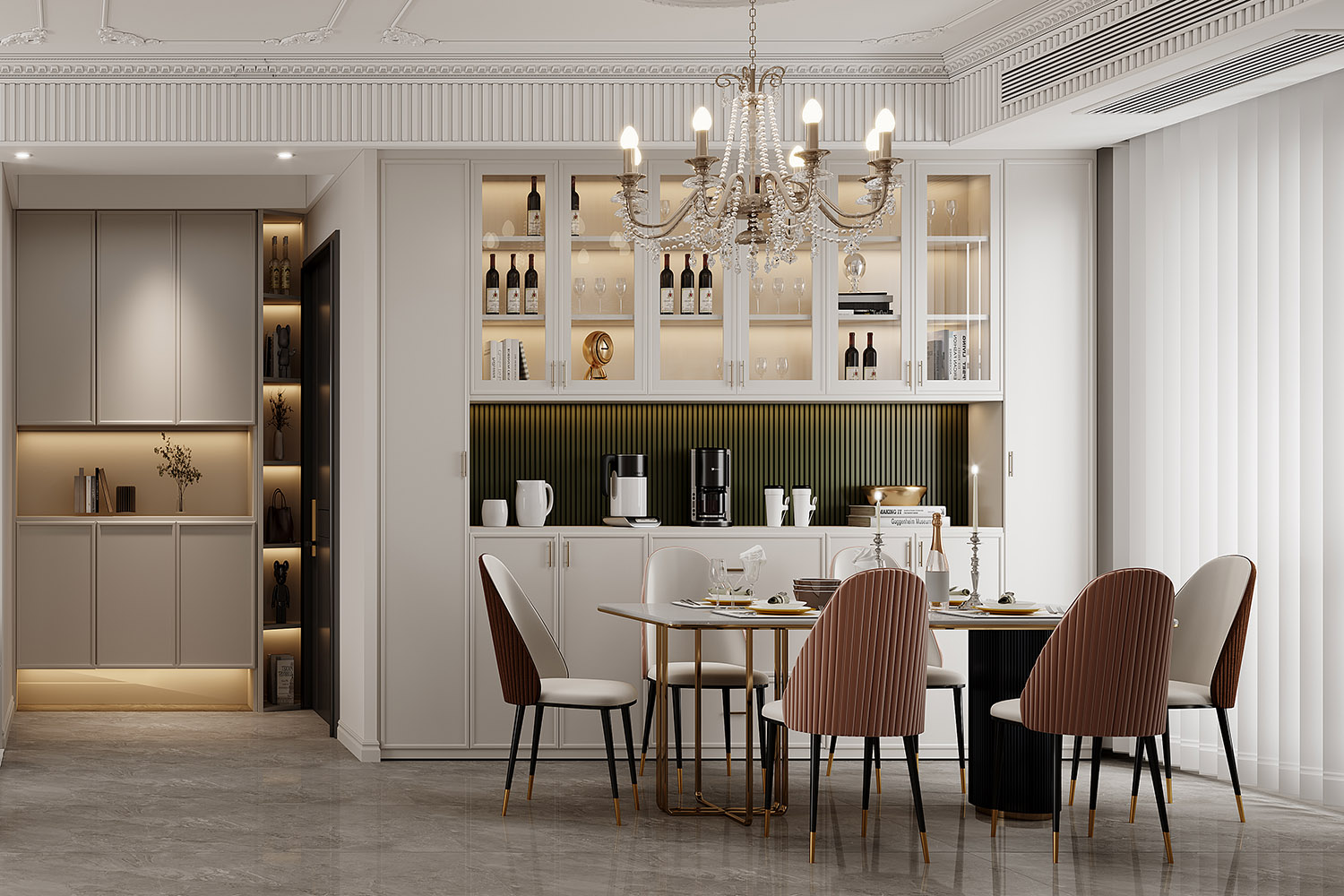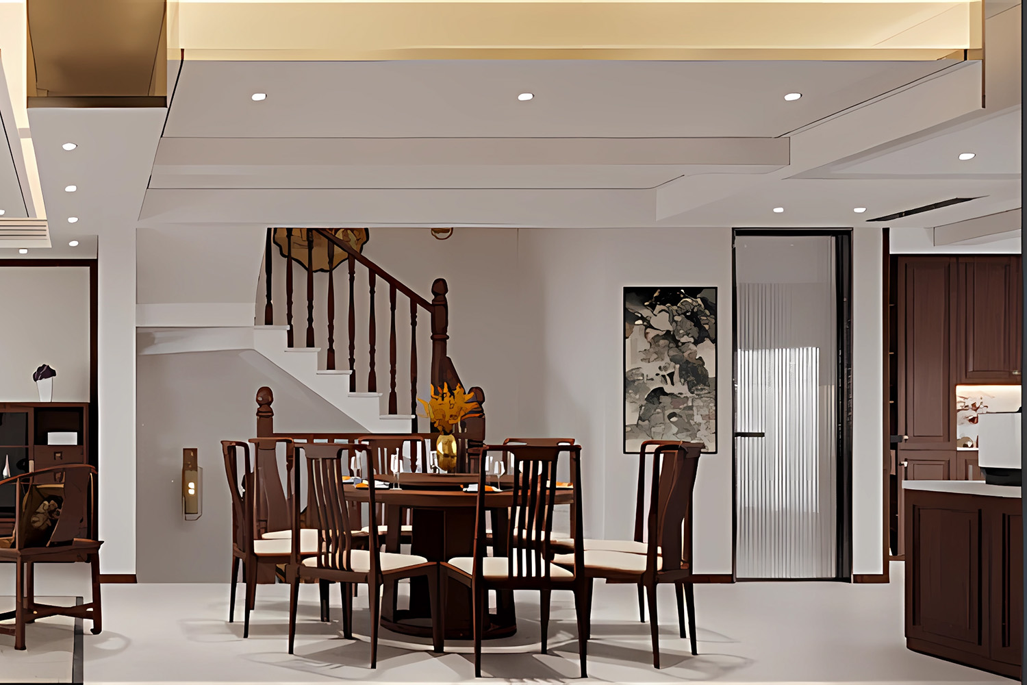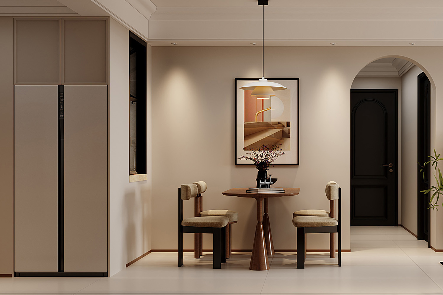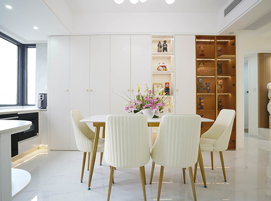 嵌入式双开大冰箱存在感不强且能够满足日常使用需求,长条形浅色餐桌耐看且能够满足多位家庭成员的就餐需求。
