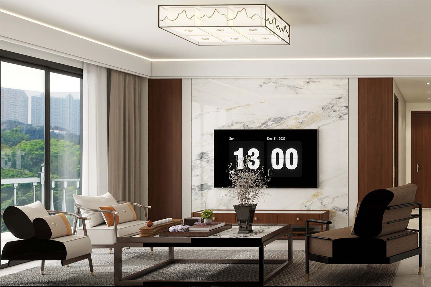万科四季花城这套140㎡的三居室住宅整体结构近似正方形,因此设计师在进行空间规划设计的时候就将客厅作为核心店 6686官方版app,其他功能区域则围绕客厅展开设计,以确保整体空间的和谐感,由于房屋面积不算宽敞,因此设计师在进行装饰设计的时候舍弃了大量中式造型设计,而是借助色彩的搭配与传统韵味画来展示空间的清新古韵感。