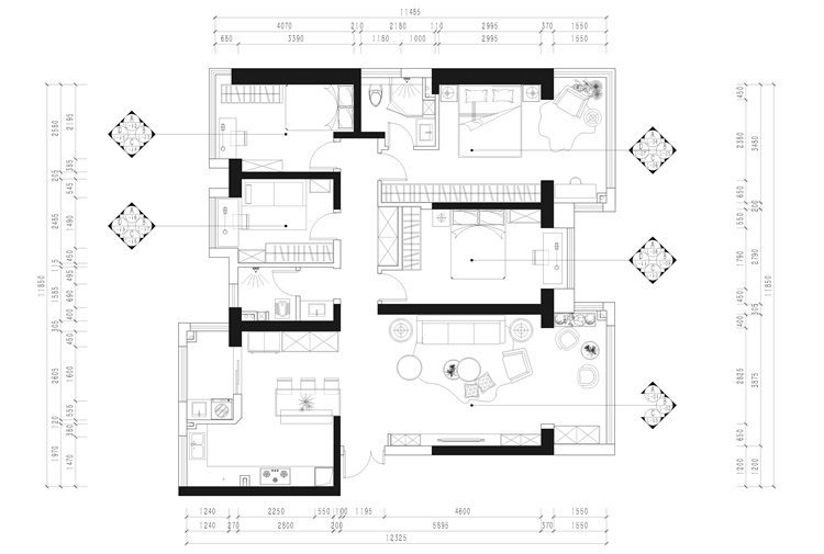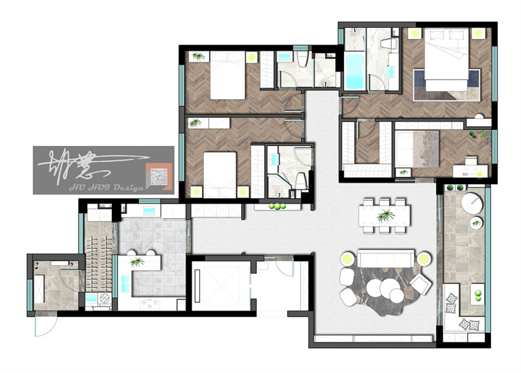 西北湖一号这套四居室的占地面积约为199㎡,户型结构并不规整,尤其是入户区域的空间过多 6686官方版app,因此设计师将入户区域进行改造,借助户型本身自带的拐角进行视觉装饰,提升室内隐私感,同时借用一些色彩,图案装饰,提升玄关区域的视觉美感感,为了业主业主及家庭人员的起居使用需求,空间中共规划了三个卫浴区域,其中主卧带一个,保姆房带一个,提升空间私密性,而另外一个则作用共用洗浴空间,满足客人的使用需求。