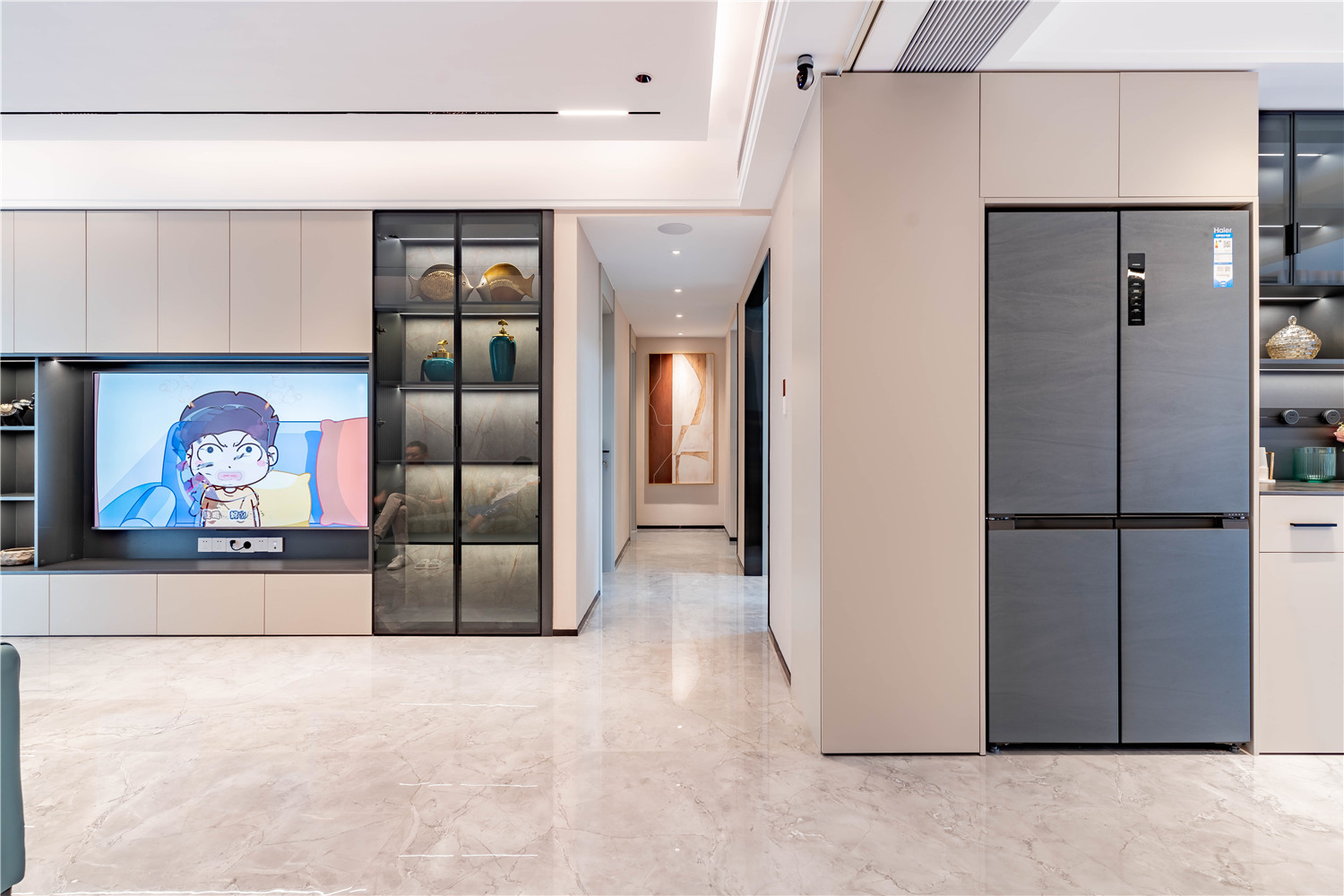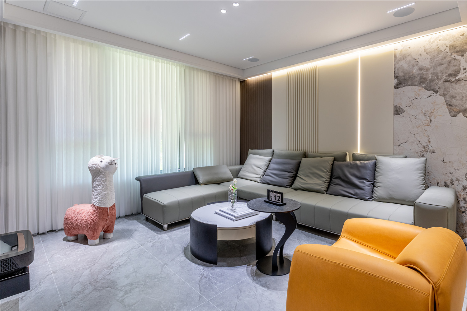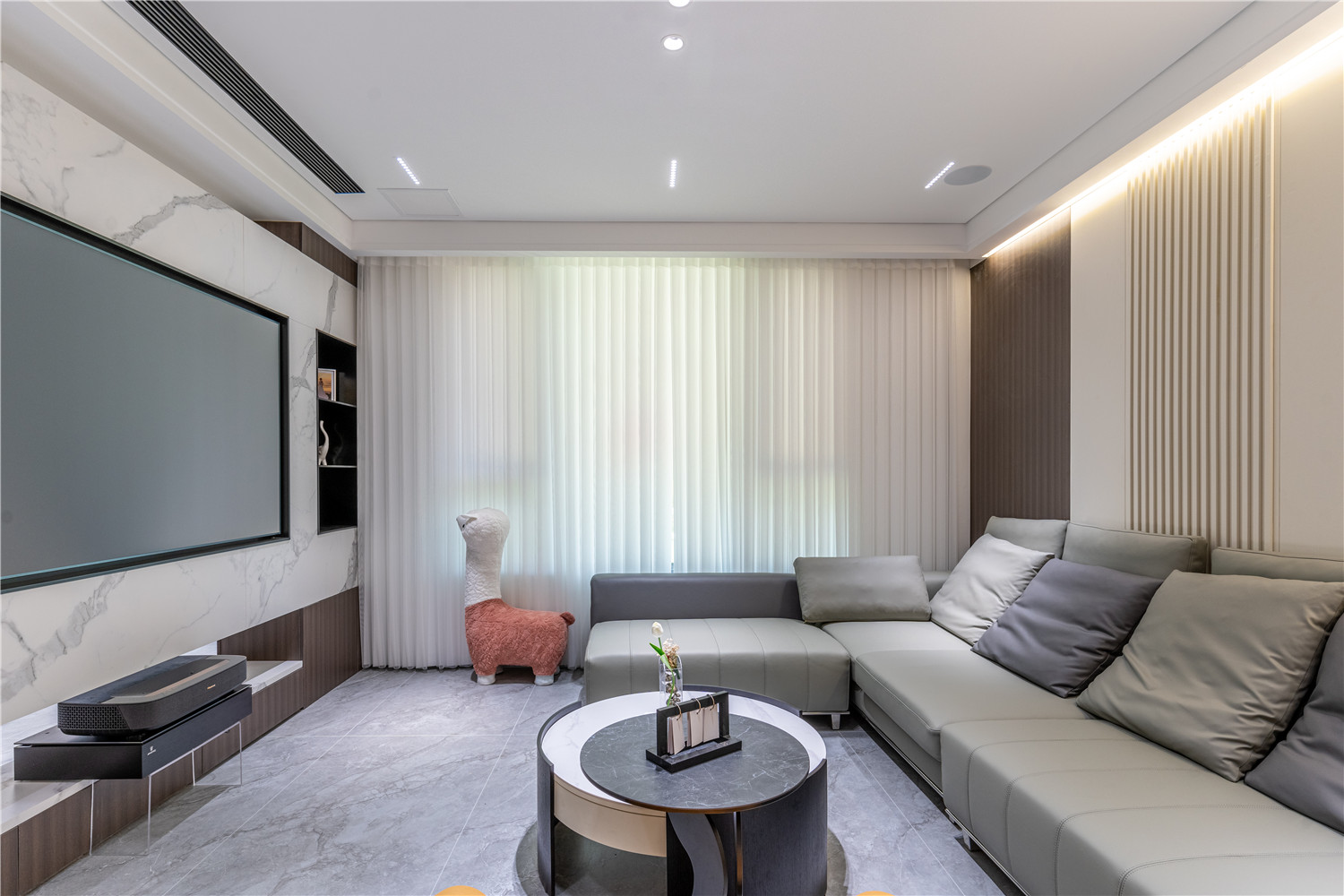 华润翡翠城这套四居室的占地面积约为138㎡,户型结构呈现长方形,原有的功能区域已经大致完成,而由于客厅区域面积过于狭长,因此设计师在进行规划的时候借助软隔断分隔出一个就餐区域,以避免会客区域显得过于空荡。大面积的阳台则利用大面积的玻璃设计将室外景观带入室内,再搭配以简约的家具,满足业主们观赏自然美景的需求。