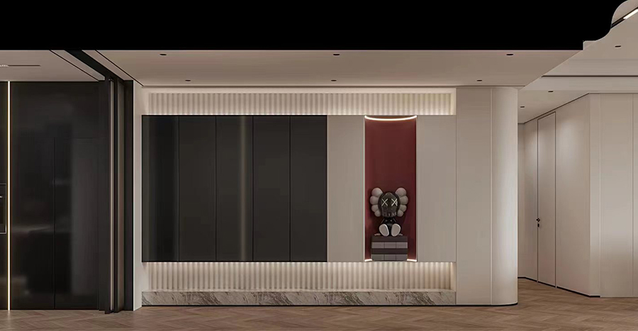 玄关区域借助木质置物柜简约清新而又实用,满足主人出入户时的衣物放置、替换需求。