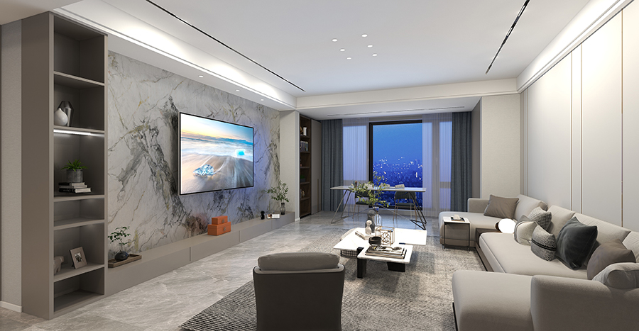 客厅配色温和舒适,地面铺以大理石装饰,沙发触感相当柔和细腻,让整体看起来十分富有质感;电视墙的设计恰好呼应了客厅风格,增加了空间的时尚感;阳台空间增设了收纳柜和办公桌椅,起到一定的延伸作用。