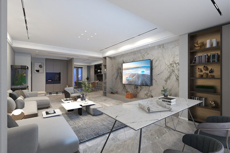 客厅当中以大地系配色为主,灰色大理石与沙发相互点缀,在轨道灯的相互映托下,整个空间变得更加温馨低奢 6686官方版app。
