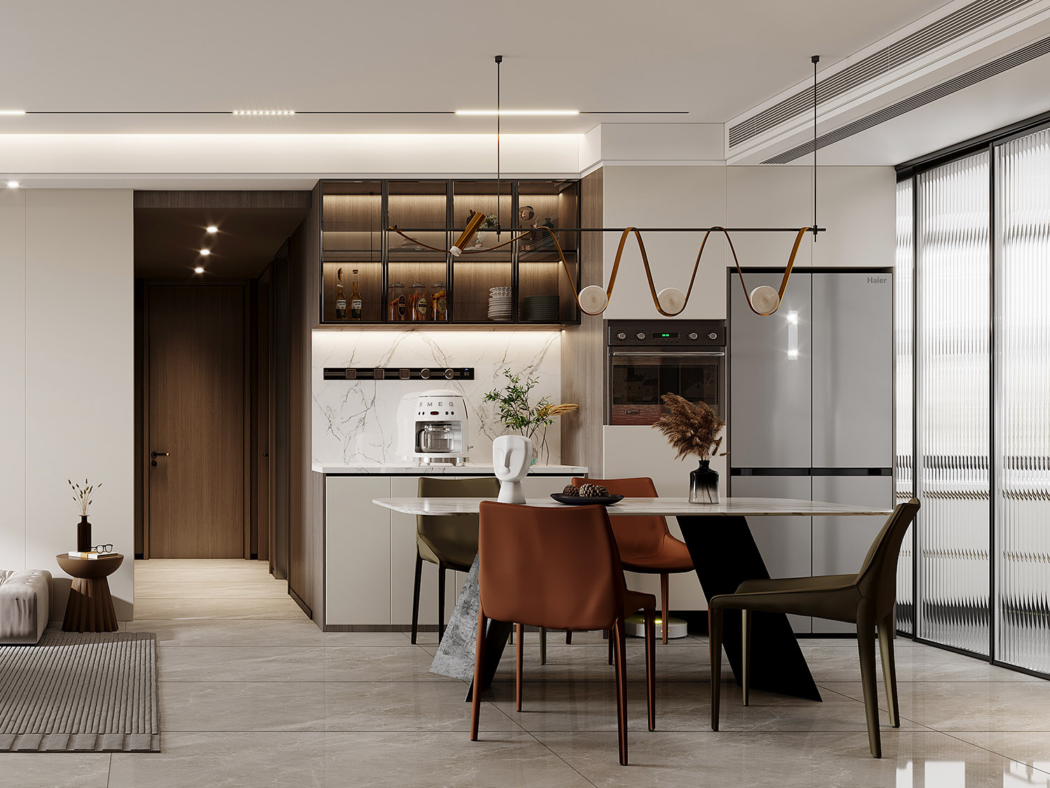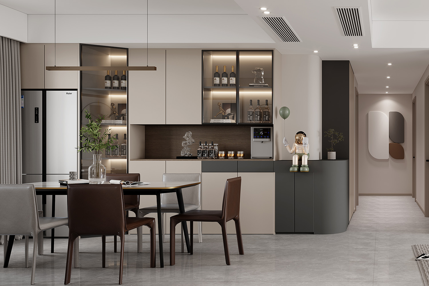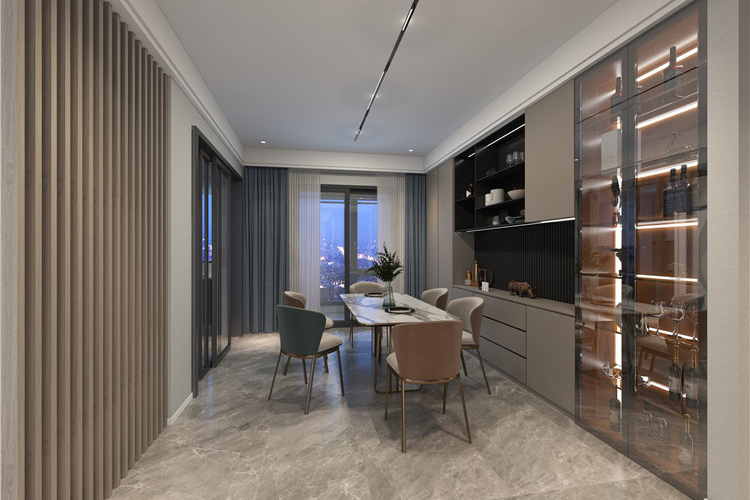 餐厅采用无主灯设计,顶面以轨道灯和筒灯为主,无形中拉升了空间的层高,背景墙看起来非常简洁,餐边柜收纳功能强大,美观与实用性兼具,灯带的铺贴给人带来一种舒适的感觉。