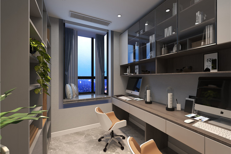 书房空间看上去十分开阔,临窗设计了写字桌一体柜,家居的色调看起来非常和谐 6686官方版app,墙面嵌入式设计了衣柜和收纳柜,营造出一种优雅的气息,空间中满满的现代风。