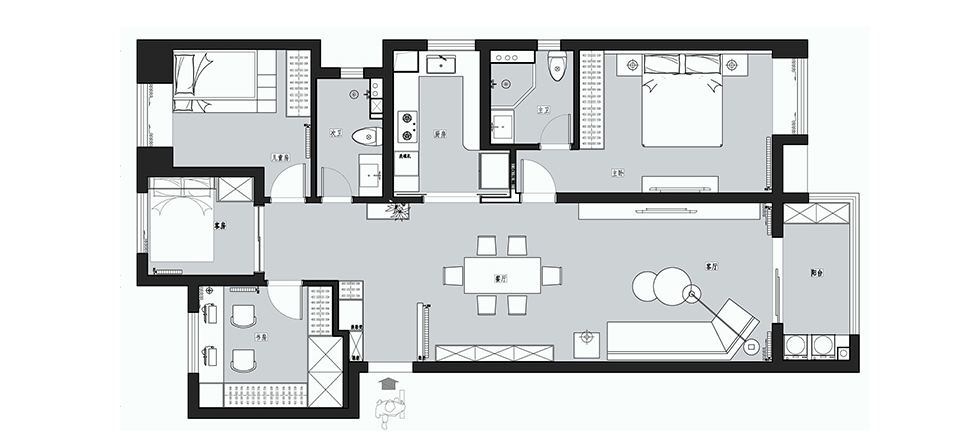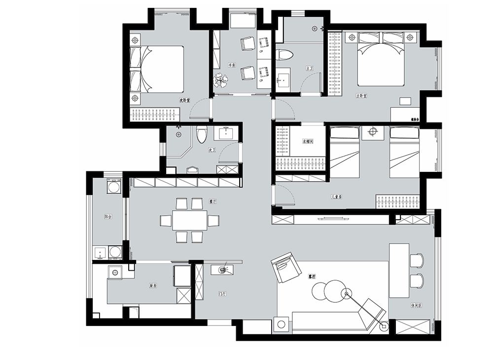 户型整体方正,因进门见厅影响风水,玄关处增置了隔断,客餐采用开放式设计,阳台放置了桌椅,便于业主日常办公,厨餐采用半开放式布局,且厨房邻近阳台 6686官方版app,油烟不容易堆积,卧室集中分布,主卧带有卫生间,儿童房带有衣帽间,增加了空间的使用率和舒适度。