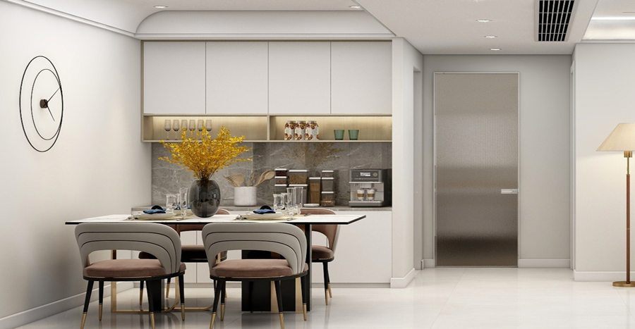 东湖城这套四居室的住宅占地面积约为126㎡,户型结构并不规整,尤其是入户区域向外延伸的空间显得过于突兀。因此设计师在进行规划设计的时候,重新进行了功能分区的划分,同时考虑到主人生活的私密度与空间实用性,设计师将入户区域的空间直接改造成一个客房,满足客人过夜使用需求。而就餐区域则被设计在厨房尾部与客厅的延伸处,避免整个空间看起来过于空荡的同时有效提升空间利用率。