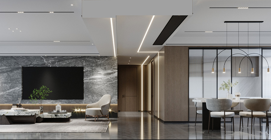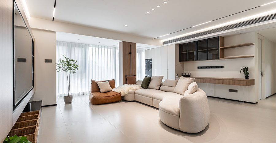 案例简介:本案例的业主是一位90后银行工作职员,对待工作严谨的他对于生活也同样是如此,因此在进行家装过程中他更重视细节的强调,希望能够通过细节强调空间的品质感。设计师在与业主进行深入沟通后,为业主选择了相对比较强调质感的现代简约风,同时借助不同质感的材料装饰空间,强调细节处的高级感。
