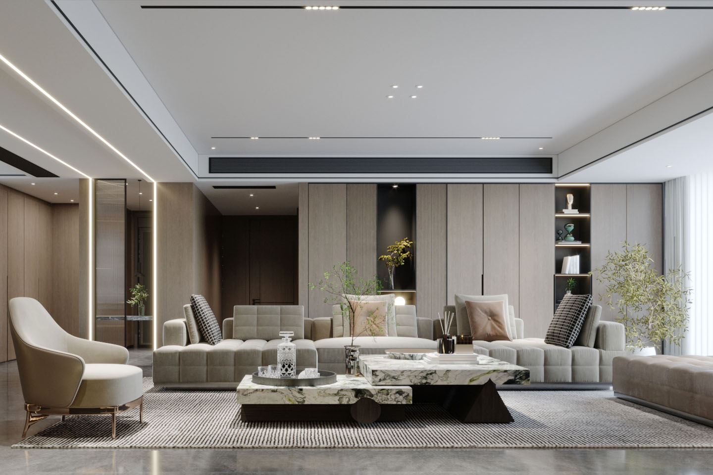 大面积的大理石材料强调高级品质感,金色吊顶搭配上华丽吊灯,强调格调与档次。