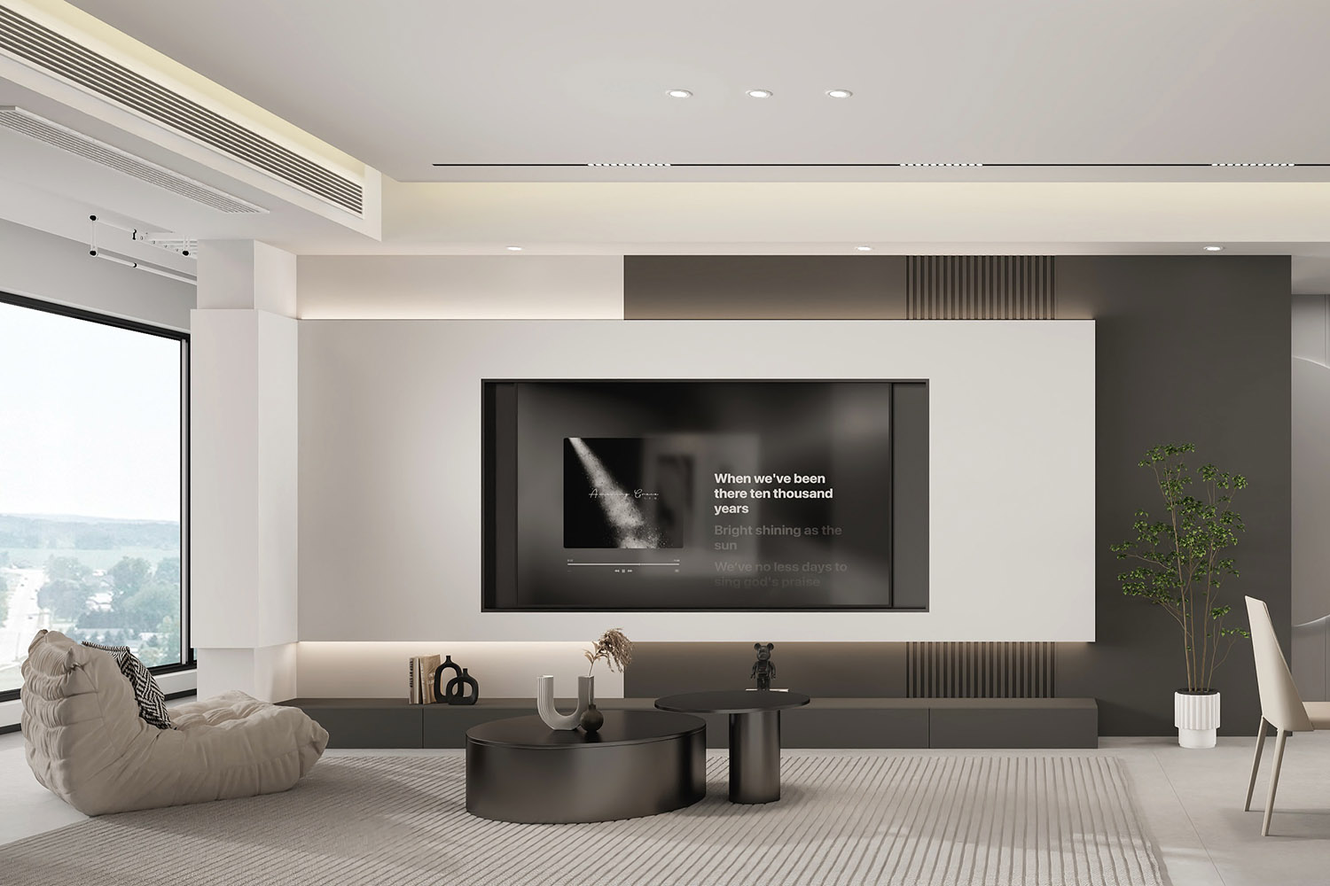 由木质与大理石材质打造的电视背景墙清新而又不失理性,镂空的设计则让空间的通透感更加强烈 6686官方版app。