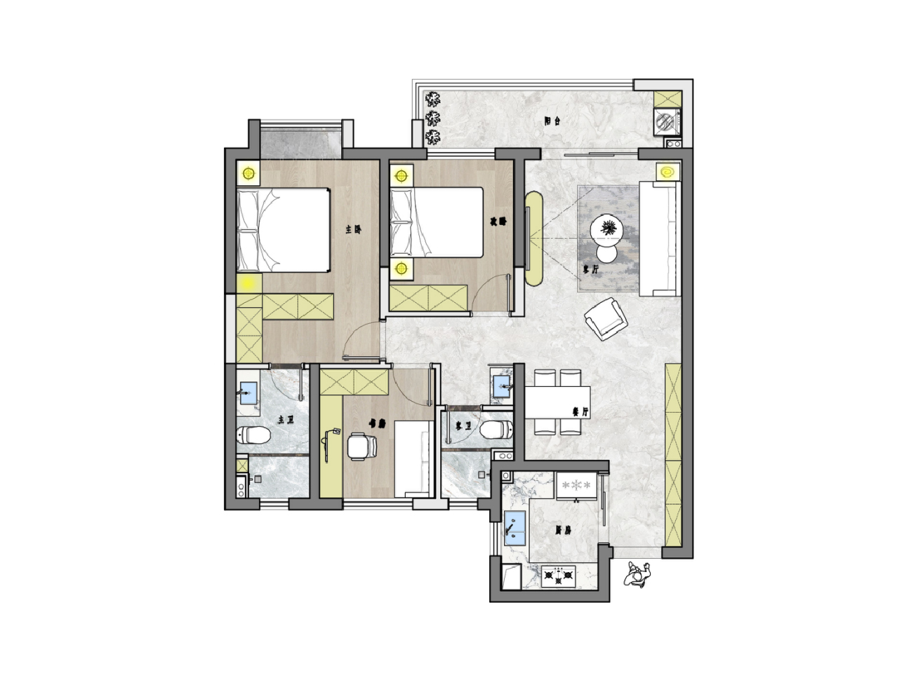 3 次卧扩充卫生间及飘窗空间,尺度合理。