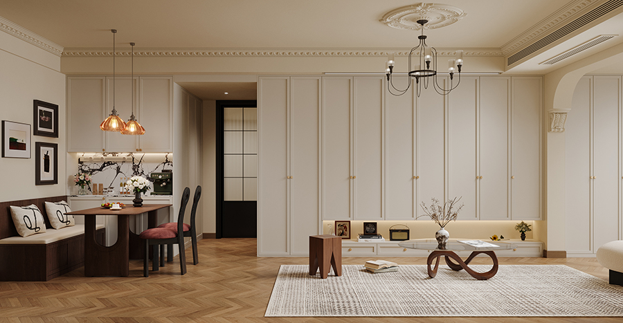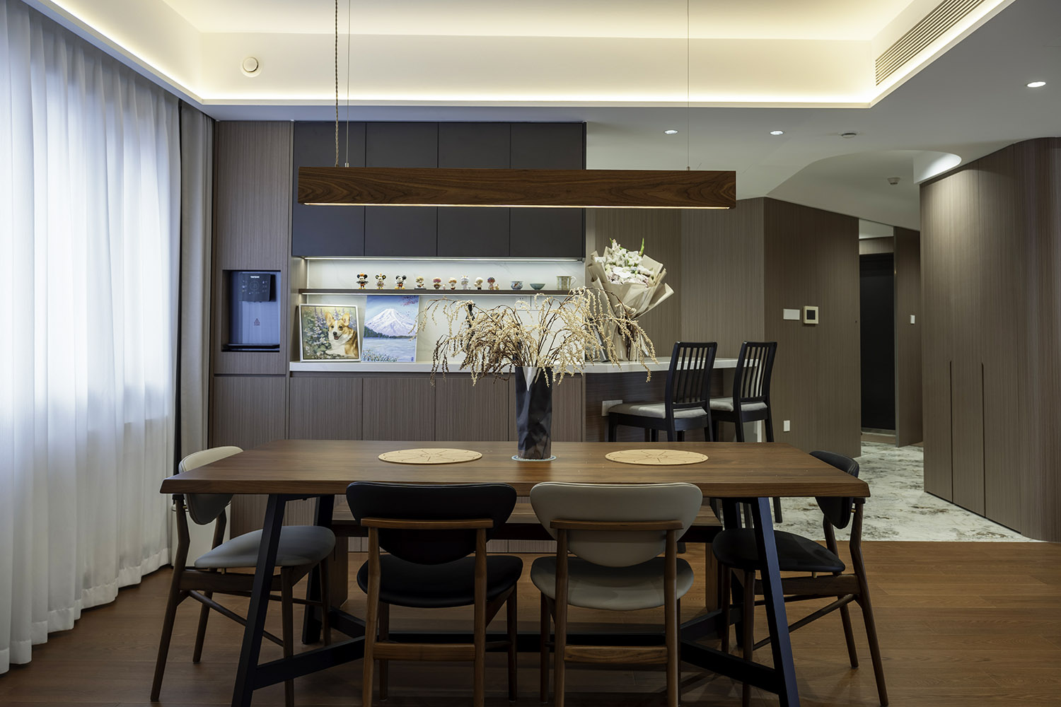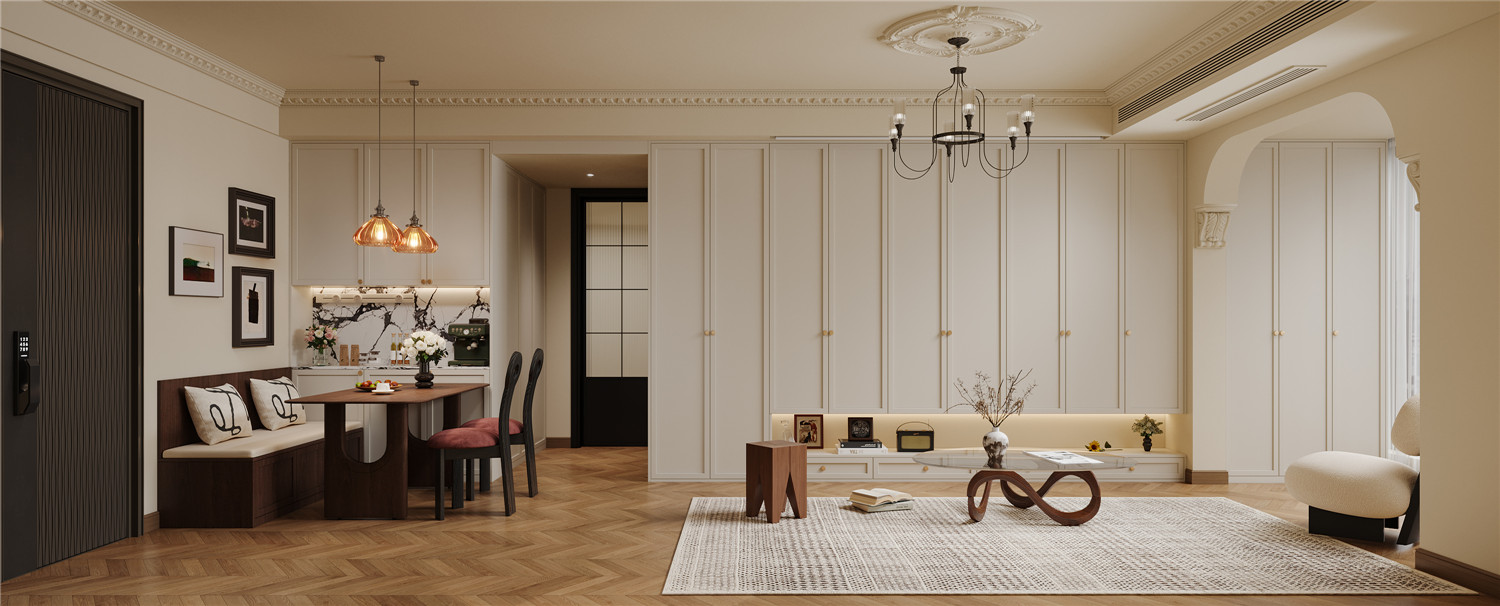 2 餐厅餐桌靠墙摆放,家居动线合理开阔,餐边酒柜美观实用。