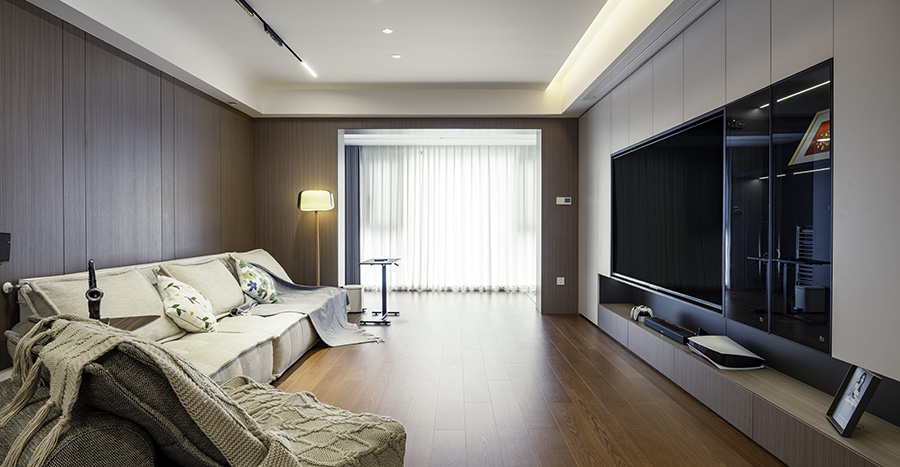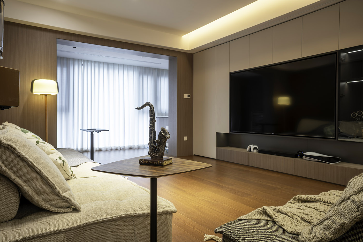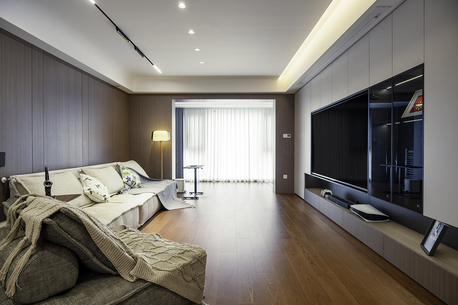 2 玄关到客厅设置一整墙背景柜,视觉大气纯净,同时增加收纳空间。