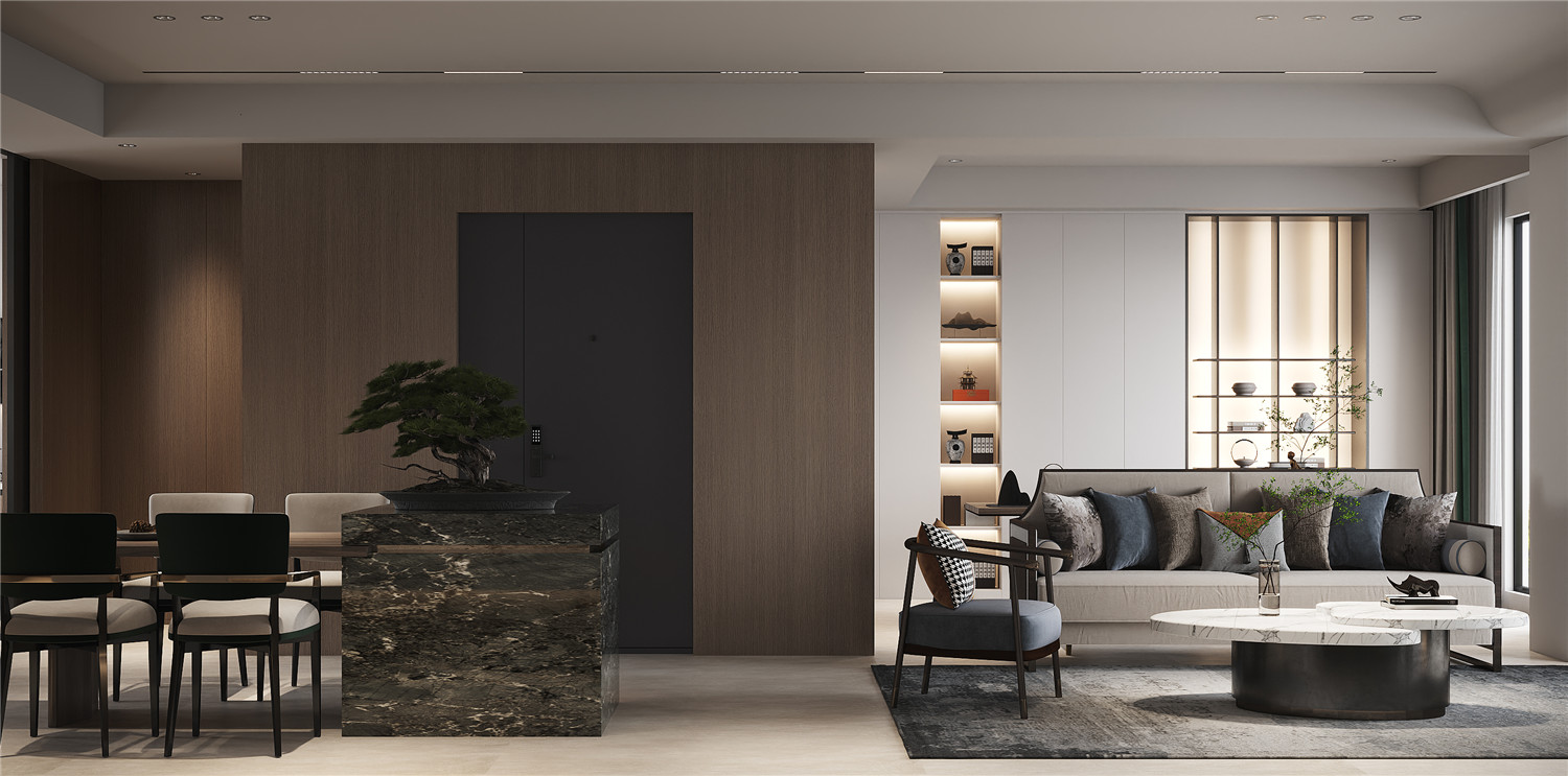 对此,设计师选择打开厨房,将空间扩大,形成餐厨一体结构,并于餐厅增设西厨台面,解决台面和冰箱问题 6686官方版app,玄关处用鞋柜隔开过道和餐厅,形成双动线,让空间更加通透和有趣,主卧室把衣帽间和阳台书房利用进来,使空间更合理,功能更强大。