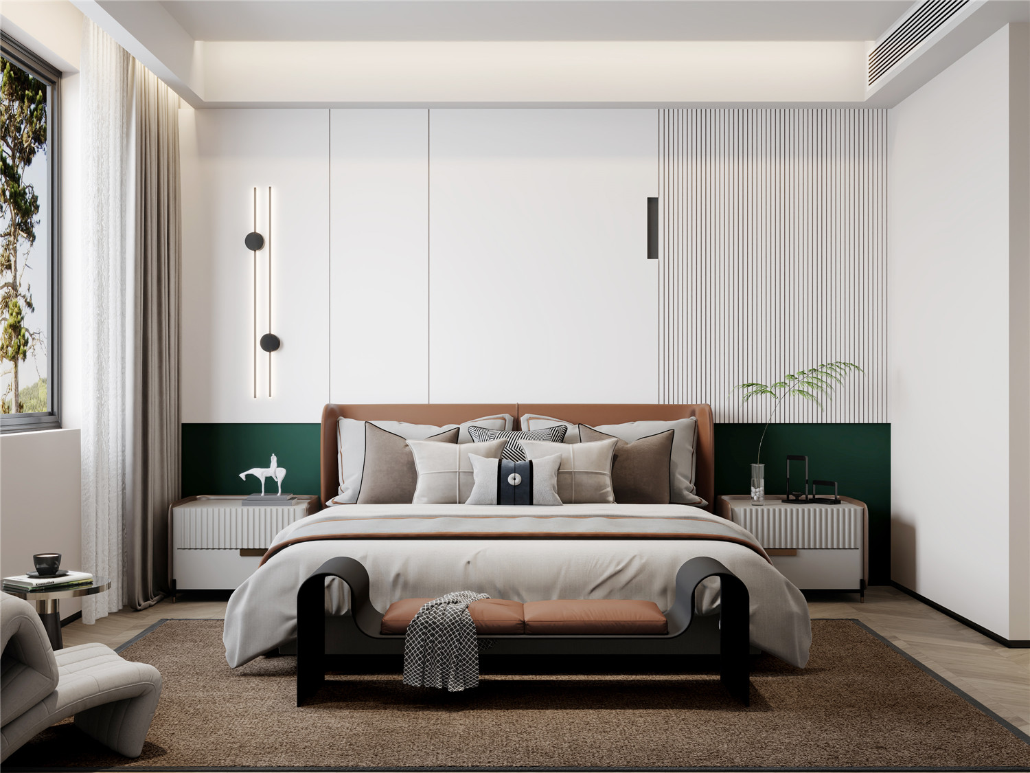 原有结构的横梁较为突兀,设计师以层级吊顶设计,完美衔接墙体与顶面,让横梁结构更美观和谐 6686官方版app,床头硬包造型线条简洁流畅,再以金色线框勾勒点缀,简约不失质感,主卧整体的配色以清浅柔和为主,营造出温馨舒适的就寝氛围。