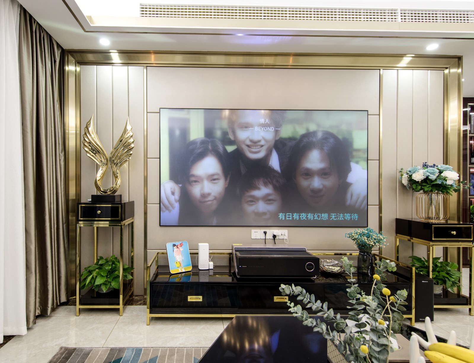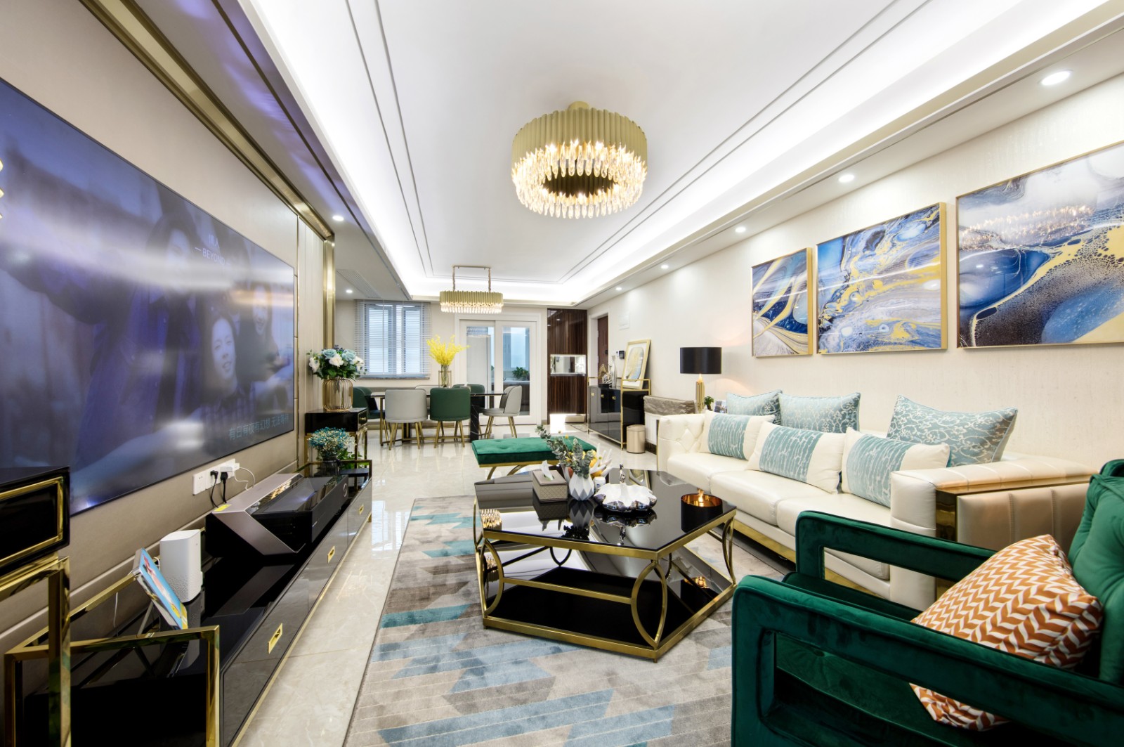 白色水泥墙搭配上镶金边处理的电视背景墙 6686官方版app,一种典雅的轻奢氛围呼之欲出,绿色的丝绒沙发,则让空间的色彩感更为跳跃活泼。