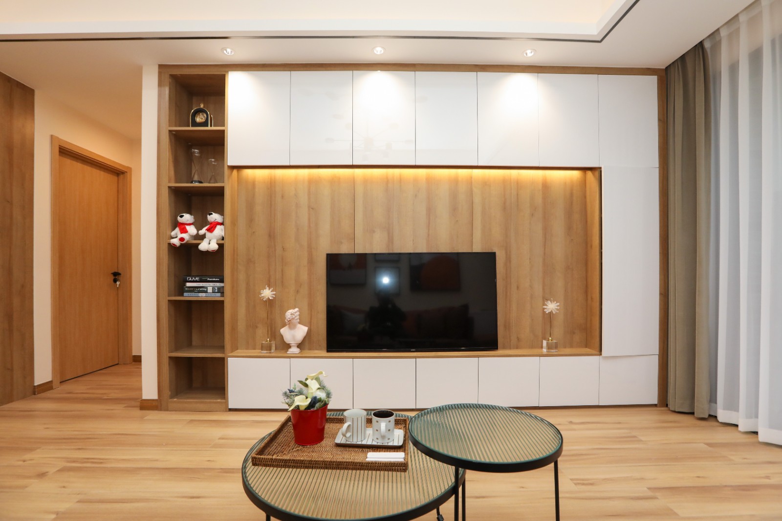 为了节省空间占用,客厅区域的电视背景墙巧妙的使用了一个原木混白色的储物柜作为装饰,简约而又不失实用性 6686官方版app。