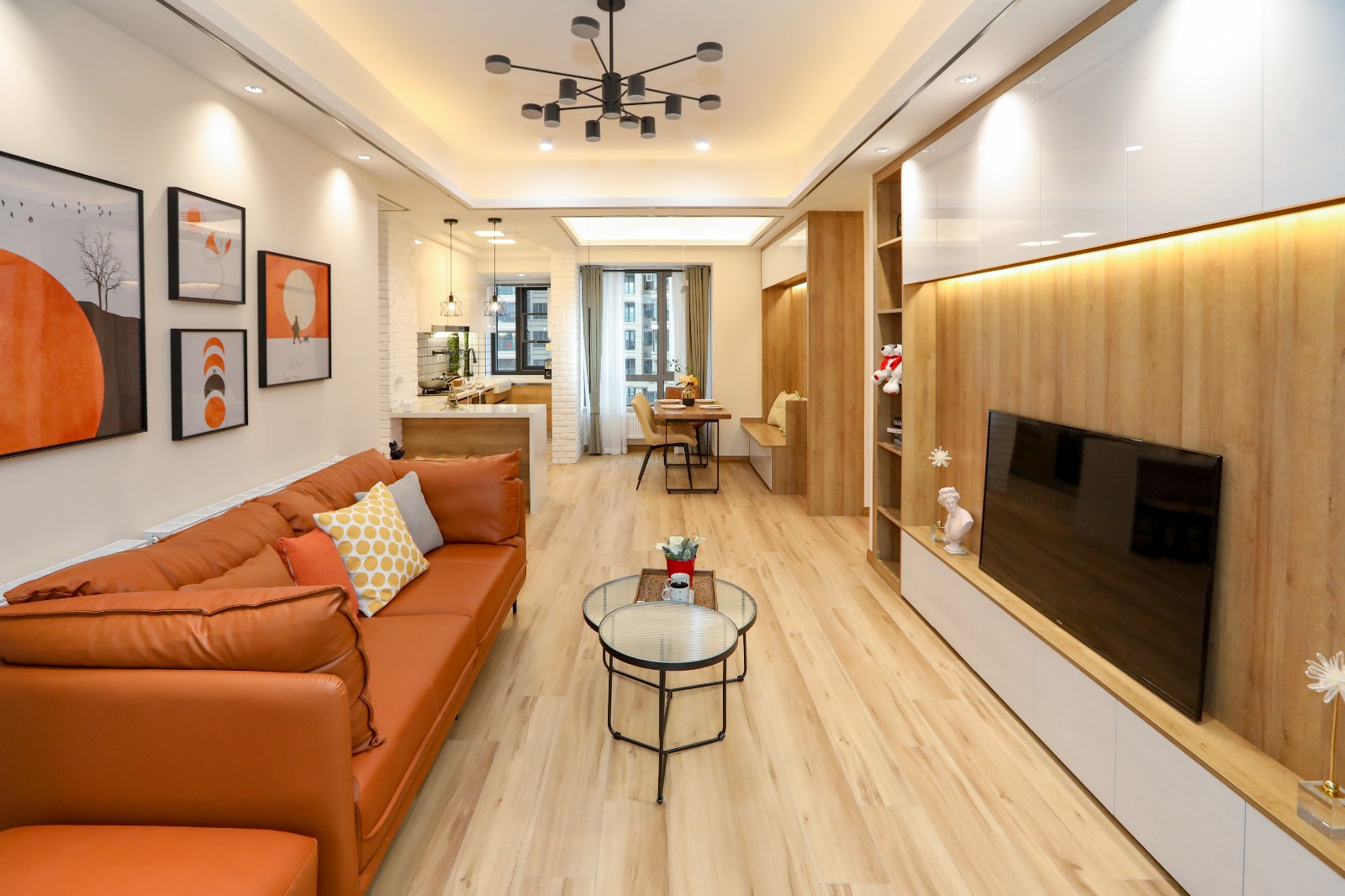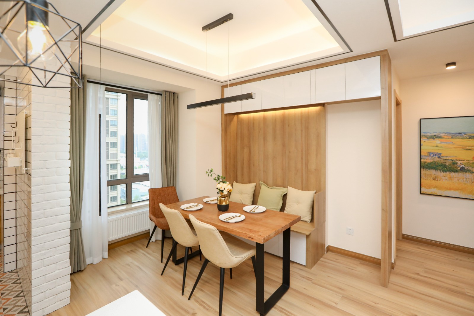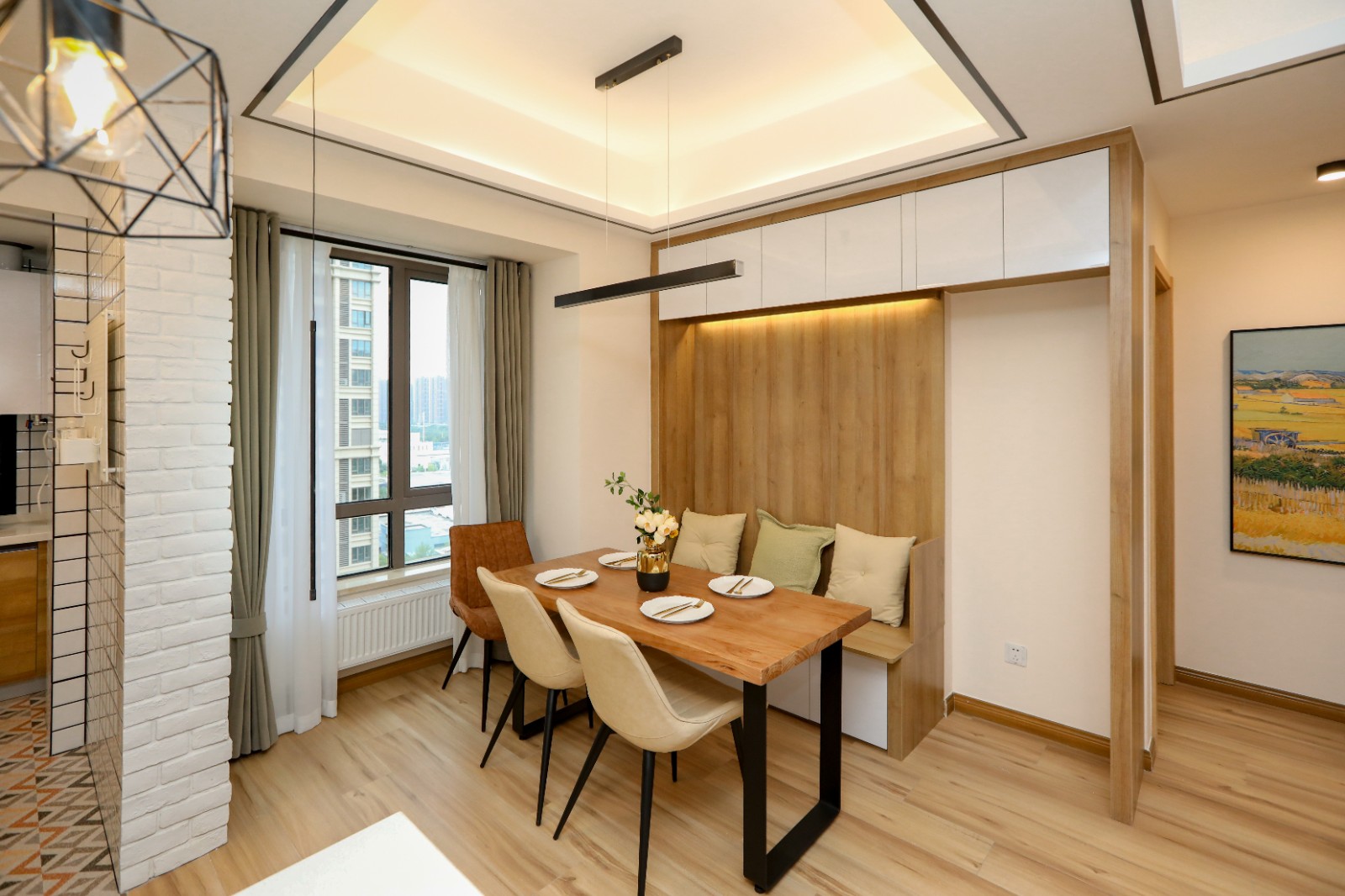 星湖公馆的这套108㎡的三居室房屋结构其实并不算方正,整体结构呈现为L形态,为了将空间进行更加合理的规划,设计师将主卧,书房设置在面积较广的左边空间,而半边区域则打造为次卧,以提升居住者的实密度,而就餐区域则设置在客厅的纵向线条处 6686官方版app,同时不做硬隔断,以避免空间显得压抑紧迫。