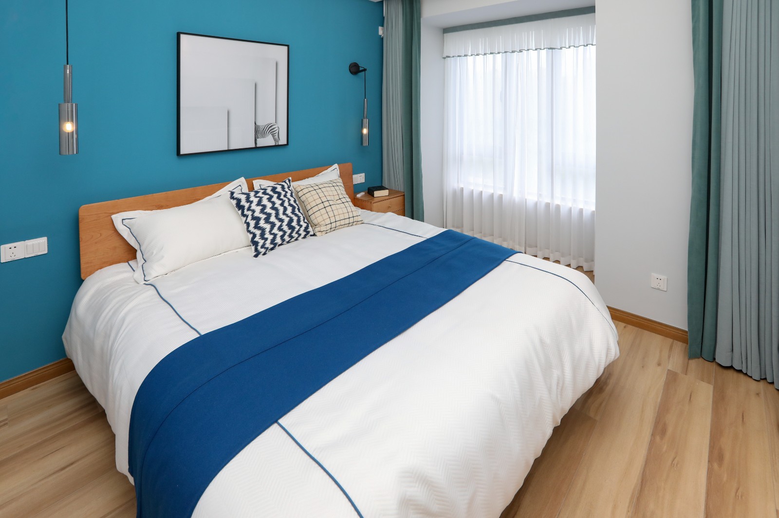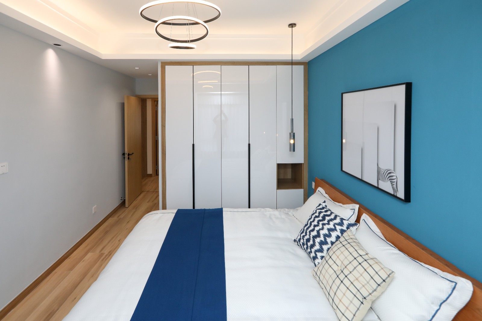 卧室区域选用了给人静谧感的蓝色作为主基调色,以提升居住者的睡眠质量,而半隐形的白色衣柜既可以满足使用需求,又不会过于突兀 6686官方版app。