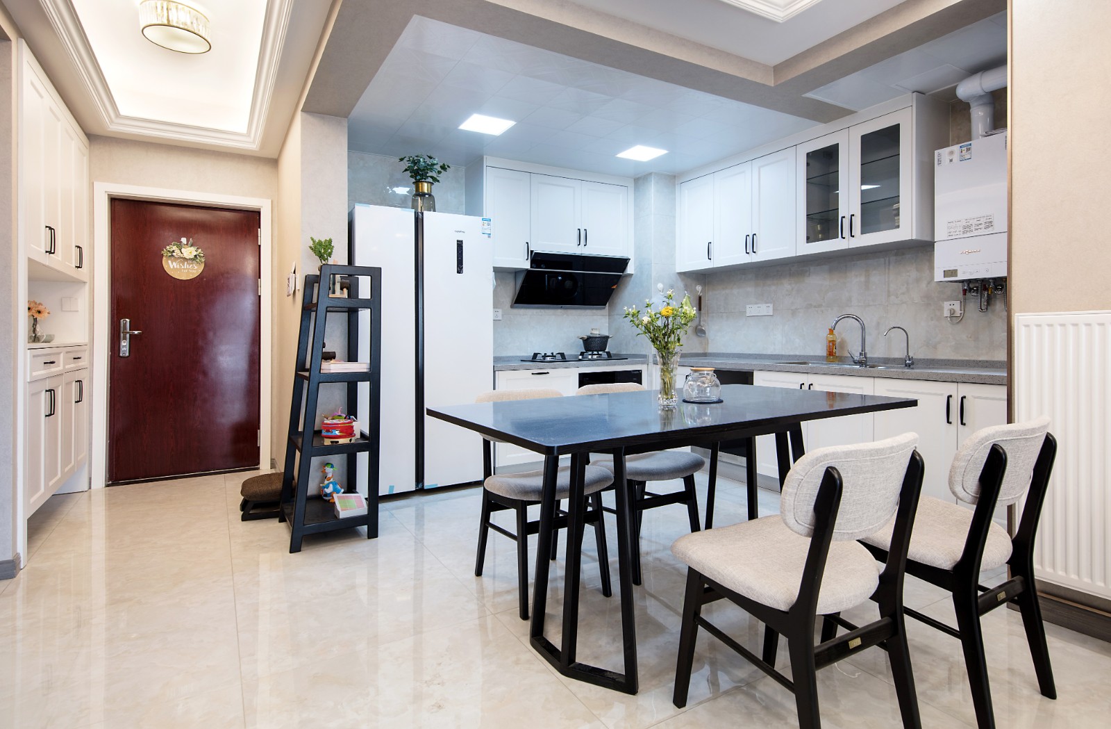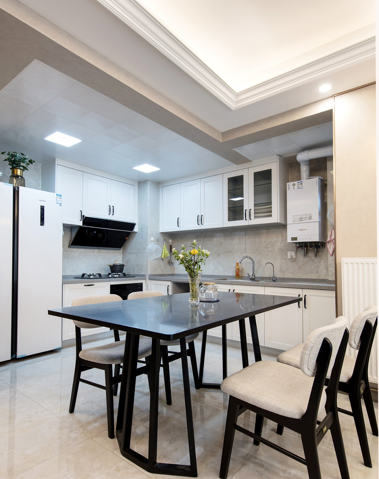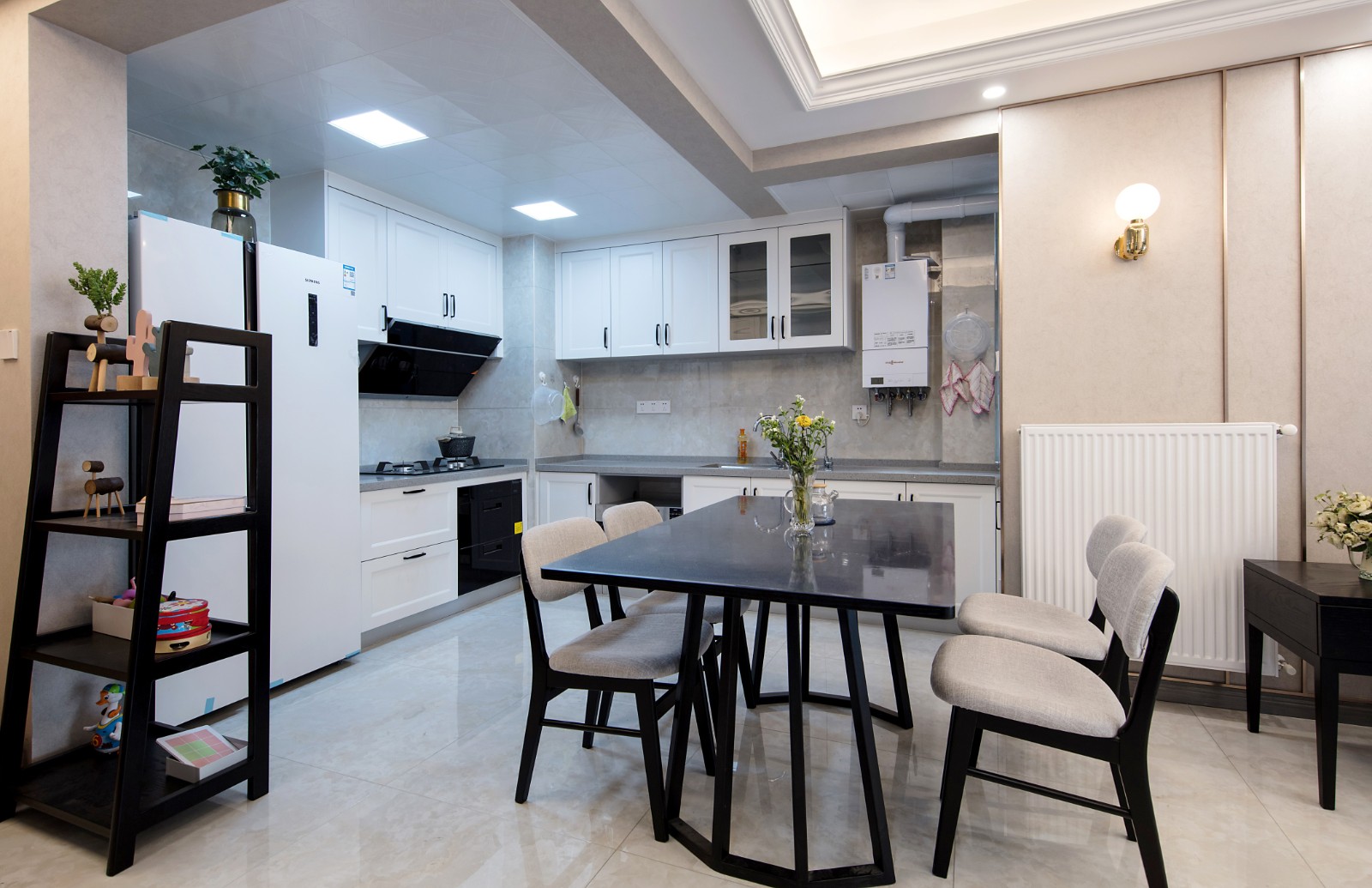 餐厅区域与开放式的厨房设计在一块区域 6686官方版app,有效节约了室内空间,而黑白配色的桌椅简约耐看搭配以花束,温馨而又不失情趣感。
