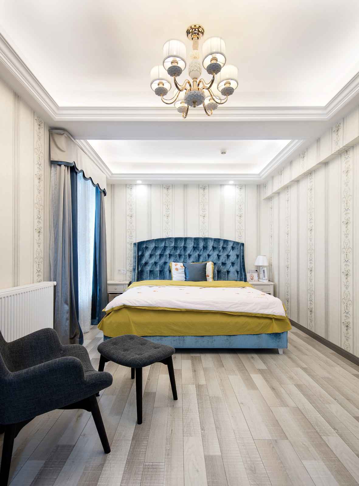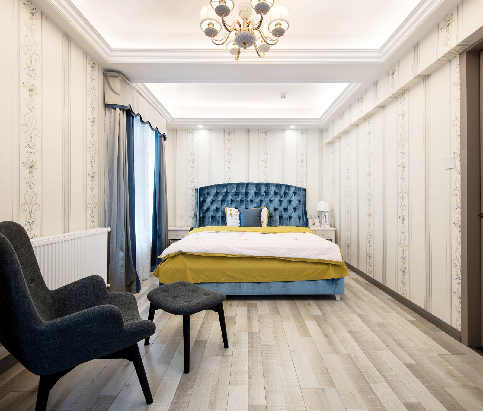 带有木质质感的地板贴纸,墙贴强调了空间的自然气息 6686官方版app,蓝色床具与灰色曲线沙发则让空间多一抹柔和明亮气息。