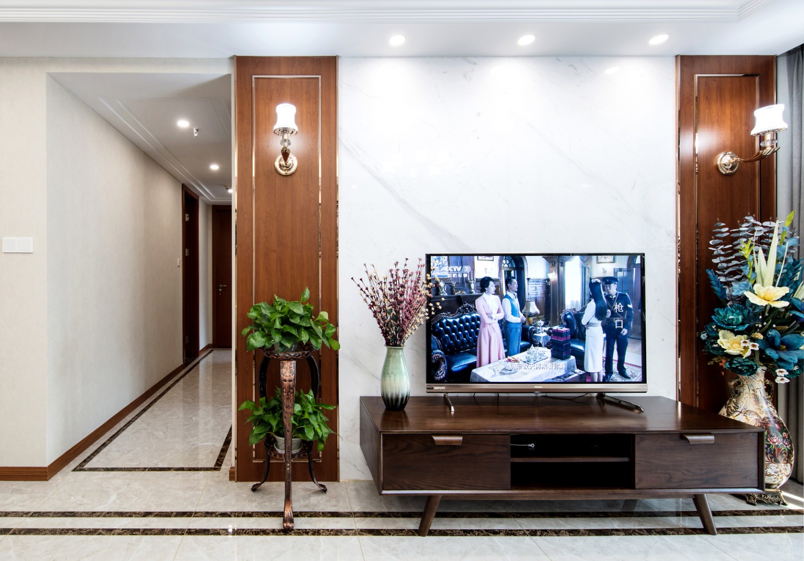 大理石打造的电视背景墙清新而又不失高贵感,搭配上对称式木质结构,平添一抹温厚柔和之美 6686官方版app。