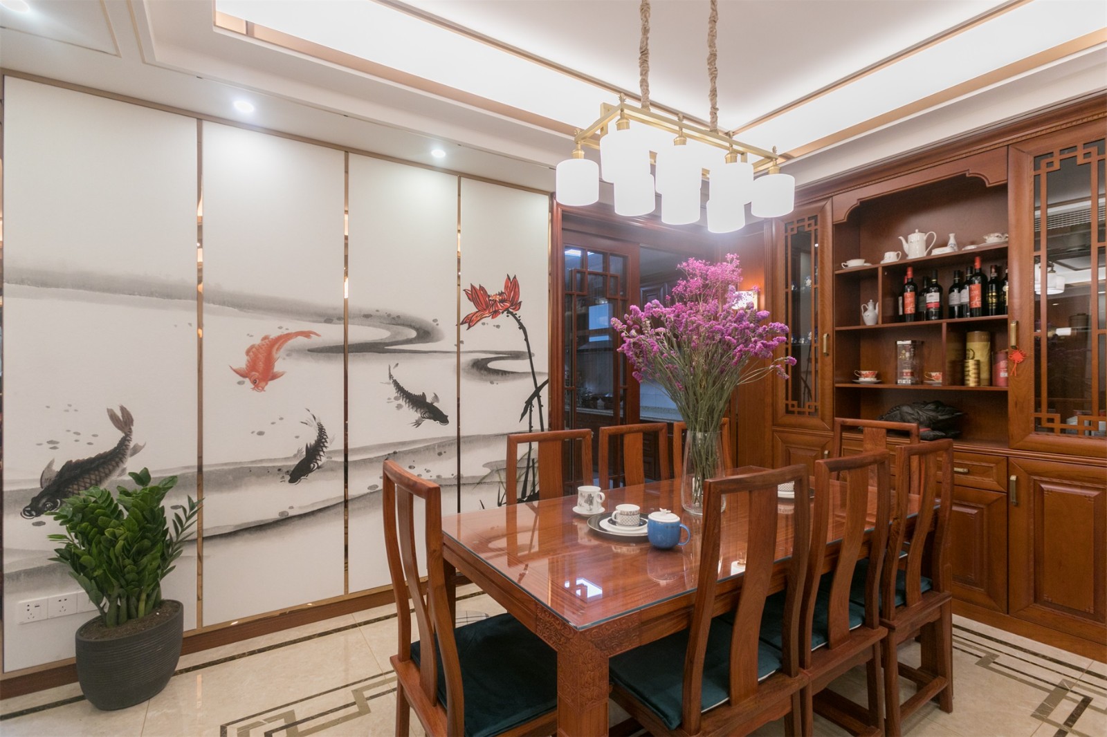 餐厅区域借用淡雅的水墨画起到视觉延伸的作用 6686官方版app,搭配以各类带有木材纹理的木质家具,强调一种空灵的自然典雅之美。