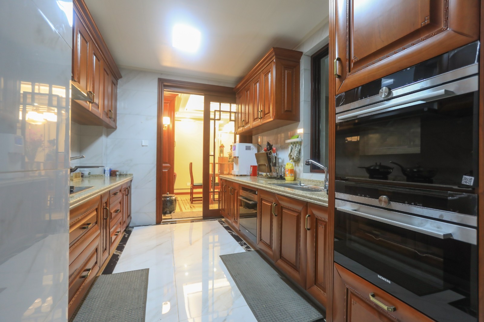 这套位于绿地金融国际城的四居室房屋面积虽然在220㎡左右,但是由于户型并不方正平整,且存在着零碎角落,因此存在着较大的设计难题,为了让所有的空间都得到合理的充分利用,化解户型缺陷,设计师对空间进行了再规划,将入户处左边的狭长条区域打造成厨房,利用户型的转折减少油烟进入生活空间的概率 6686官方版app,同时将该区域进行一定的再切割,规划出一块置物空间,有效提升了家居空间的利用率。